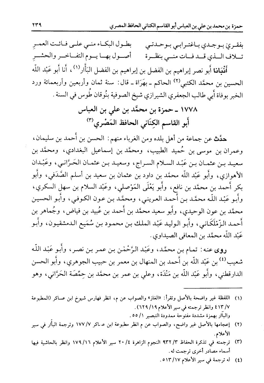 1778 - حمزة بن محمد بن علي بن العباس أبو القاسم الكناني الحافظ المصري (3) حدث عن جماعة من أهل بلده ومن الغرباء منهم الحسن بن أحمد بن سليمان وعمران بن موسى بن حميد الطبيب ومحمد بن إسماعيل البغدادي ومحمد بن سعيد بن عثمان بن عبد السلام السراج وسعيد بن عثمان الحراني وعبدان الأهوازي وأبو عبد الله محمد بن داود بن عثمان بن سعيد بن أسلم الصدفي وأبو بكر أحمد بن محمد بن نافع وأبو يعلى الموصلي وعبد السلام بن سهل السكري وأبو عبد الله محمد بن أحمد العريني ومحمد بن عون الكوفي وأبو الحسين محمد بن عون الوحيدي وأبو سعيد محمد بن أحمد بن عبيد بن فياض وجماهر بن أحمد الزملكاني وأبو الوليد عبد الملك بن محمود بن سميع الدمشقيون وأبو عبد الله محمد بن المعافى الصيداوي روى عنه تمام بن محمد وعبد الرحمن بن عمر بن نصر وأبو عبد الله شعيب (4) بن عبد الله بن أحمد بن المنهال بن معمر بن حبيب الجوهري وأبو الحسن الدارقطني وأبو عبد الله بن مندة وعلي بن عمر بن محمد بن حمصة الحراني وهو