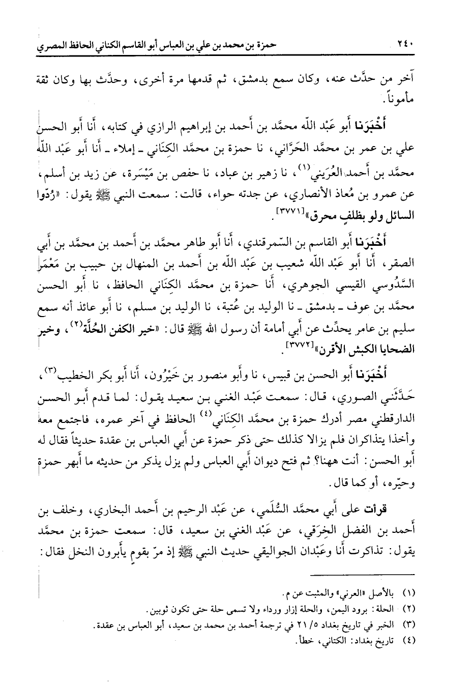 آخر من حدث عنه وكان سمع بدمشق ثم قدمها مرة أخرى وحدث بها وكان ثقة مأمونا أخبرنا أبو عبد الله محمد بن أحمد بن إبراهيم الرازي في كتابه أنا أبو الحسن علي بن عمر بن محمد الحراني نا حمزة بن محمد الكناني إملاء أنا أبو عبد الله محمد بن أحمد العريني (1) نا زهير بن عباد نا حفص بن ميسرة عن زيد بن أسلم عن عمرو بن معاذ الأنصاري عن جدته حواء قالت سمعت النبي (صلى الله عليه وسلم) يقول ردوا السائل ولو بظلف محرق (3771) أخبرنا أبو القاسم بن السمرقندي أنا أبو طاهر محمد بن أحمد بن محمد بن أبي الصقر أنا أبو عبد الله شعيب بن عبد الله بن أحمد بن المنهال بن حبيب بن معمر السدوسي القيسي الجوهري أنا حمزة بن محمد الكناني الحافظ نا أبو الحسن محمد بن عوف بدمشق نا الوليد بن عتبة نا الوليد بن مسلم نا أبو عائذ أنه سمع سليم بن عامر يحدث عن أبي أمامة أن رسول الله (صلى الله عليه وسلم) قال خير الكفن الحلة (2) وخير الضحايا الكبش الأقرن (3772) أخبرنا أبو الحسن بن قبيس نا وأبو منصور بن خيرون أنا أبو بكر الخطيب (3) حدثني الصوري قال سمعت عبد العني بن سعيد يقول لما قدم أبو الحسن الدارقطني مصر أدرك حمزة بن محمد الكناني (4) الحافظ في آخر عمره فاجتمع معه وأخذا يتذاكران فلم يزالا كذلك حتى ذكر حمزة عن أبي العباس بن عقدة حديثا فقال له أبو الحسن أنت ههنا ثم فتح ديوان أبي العباس ولم يزل يذكر من حديثه ما أبهر حمزة وحيره أبو كما قال قرأت على أبي محمد السلمي عن عبد الرحيم بن أحمد البخاري وخلف بن أحمد بن الفضل الخرقي عن عبد الغني بن سعيد قال سمعت حمزة بن محمد يقول تذاكرت أنا وعبدان الجواليقي حديث النبي (صلى الله عليه وسلم) إذا مر بقوم يأبرون النخل فقال