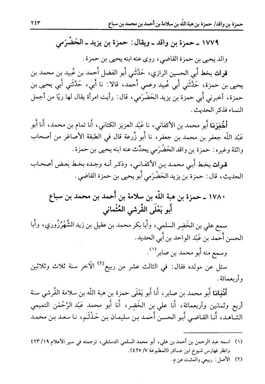 1780 - حمزة بن هبة الله بن سلامة بن أحمد بن محمد بن سباع أبو يعلى القرشي العثماني سمع علي بن الخضر السلمي وأبا بكر محمد بن عقيل بن زيد الشهرزوري وأبا الحسن أحمد بن عبد الواحد بن أبي الحديد وسمع منه أبو محمد بن صابر (1) سئل عن مولده فقال في الثالث عشر من ربيع (2) الآخر سنة ثلاث وثلاثين وأربعمائة أنبأنا أبو محمد بن صابر أنا أبو يعلى حمزة بن هبة الله بن سلامة القرشي سنة أربع وثمانين وأربعمائة أنا علي بن الخضر أنا أبو محمد عبد الرحمن التميمي الشاهد أنا القاضي أبو الحسن أحمد بن سليمان بن حذلم نا سعد بن محمد