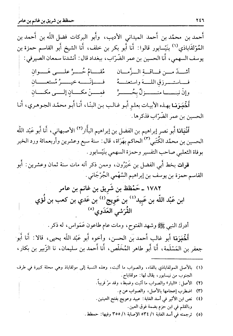 أحمد بن محمد بن أحمد الميداني الأديب وأبو البركات فضل الله بن أحمد بن المولقاباذي (1) بنيسابور قالوا أنا أبو بكر بن خلف أنا الشيخ أبو القاسم حمزة بن يوسف السهمي أنا الحسين بن عمر الضراب ببغداد قال أنشدنا سمعان الصيرفي * أشد من فاقة الزمان * مقام حر على هوان فاسترزق الله واستعنه * فإنه خير مستعان وإن نبا منزل بحر * فمن مكان إلى مكان * أخبرنا بهذه الأبيات بعلو أبو غالب بن البنا أنا أبو محمد الجوهري أنا الحسين بن عمر الضراب فذكرها أنبأنا أبو نصر إبراهيم بن الفضل بن إبراهيم البأار (2) الأصبهاني أنا أبو عبد الله الحسين بن محمد الكتبي (3) ح الحاكم بهراة قال سنة سبع وعشرين وأربعمائة ورد الخبر بوفاة الثعلبي صاحب - التفسير - وحمزة السهمي بنيسابور قرأت بخط أبي الفضل بن خيرون وممن ذكر أنه مات سنة ثمان وعشرين أبو القاسم حمزة بن يوسف بن إبراهيم السهمي الجرجاني 1782 حمظظ بن شريق بن غانم بن عامر ابن عبد الله بن عبيد (4) بن عويج (4) بن عدي بن كعب بن لؤي القرشي العدوي (5) أدرك النبي (صلى الله عليه وسلم) وشهد الفتوح ومات عام طاعون عمواس له ذكر أخبرنا أبو غالب أحمد بن الحسن وأخوه أبو عبد الله يحيى قالا أنا أبو جعفر بن المسلمة أنا أبو طاهر المخلص أنا أحمد بن سليمان نا الزبير بن بكار