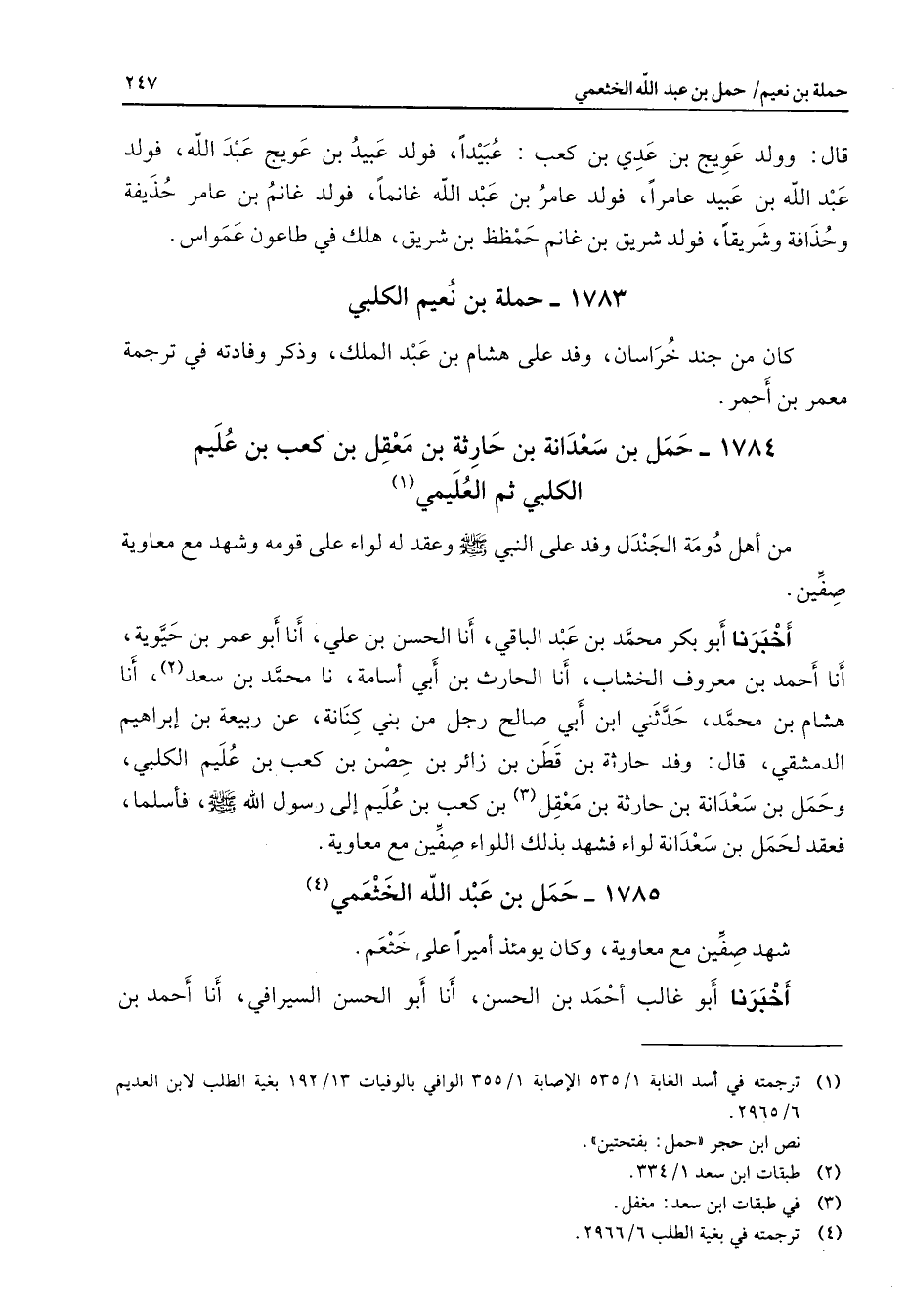 1784 - حمل بن سعدانة بن حارثة بن معقل بن كعب بن عليم الكلبي ثم العليمي (1) من أهل دومة الجندل وفد على النبي (صلى الله عليه وسلم) وعقد له لواء على قومه وشهد مع معاوية صفين أخبرنا أبو بكر محمد بن عبد الباقي أنا الحسن بن علي أنا أبو عمر بن حيوية أنا أحمد بن معروف الخشاب أنا الحارث بن أبي أسامة نا محمد بن سعد (2) أنا هشام بن محمد حدثني ابن أبي صالح رجل من بني كنانة عن ربيعة بن إبراهيم الدمشقي قال وفد حارثة بن قطن بن زائر بن حصن بن كعب بن عليم الكلبي وحمل بن سعدانة بن حارثة بن معقل (3) بن كعب بن عليم إلى رسول الله (صلى الله عليه وسلم) فأسلما فعقد لحمل بن سعدانة لواء فشهد بذلك اللواء صفين مع معاوية