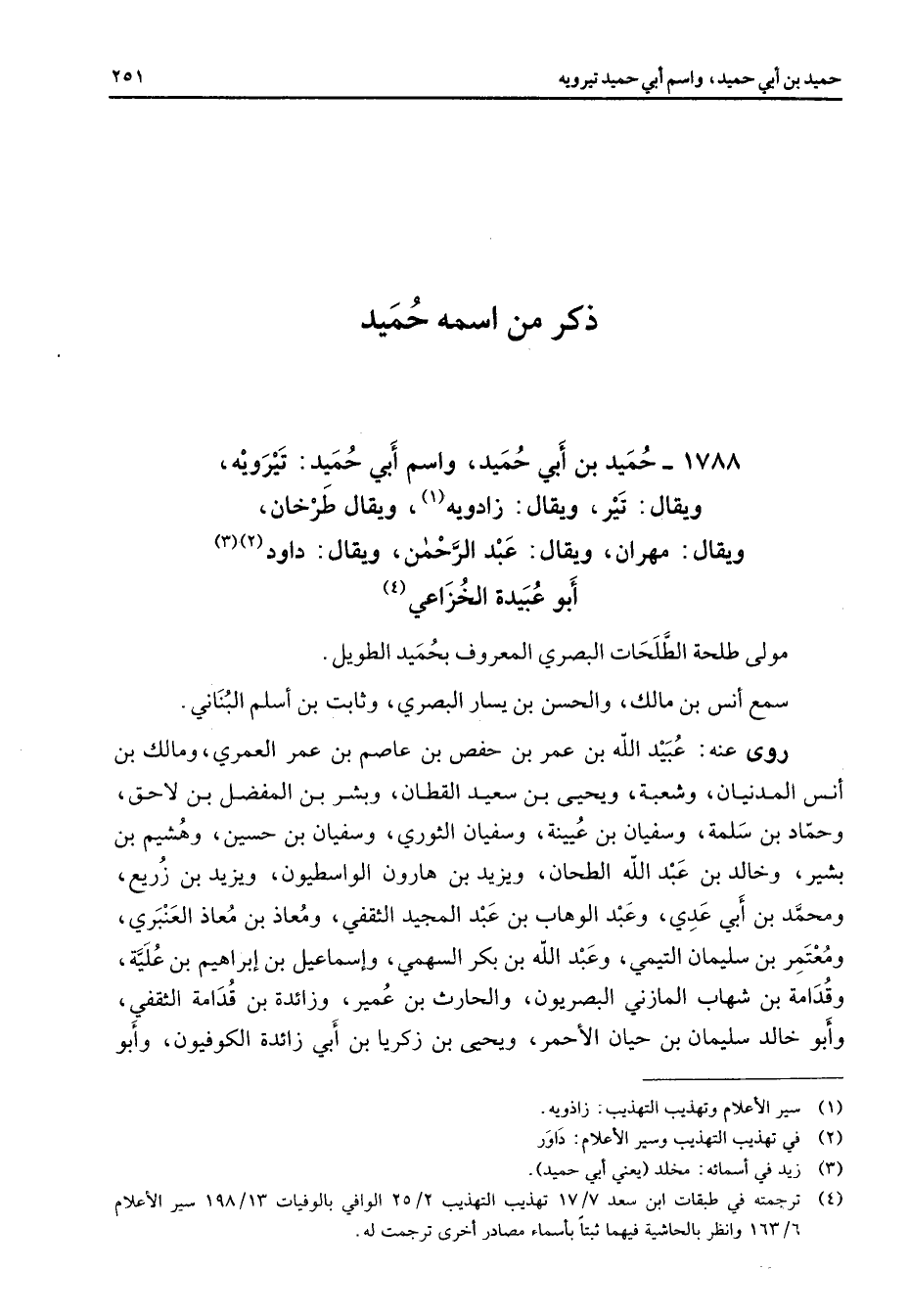 1788 - حميد بن أبي حميد واسم أبي حميد تيرويه ويقال تير ويقال زادويه (1) ويقال طرخان ويقال مهران ويقال عبد الرحمن ويقال داود (2) (3) أبو عبيدة الخزاعي (4) مولى طلحة الطلحات البصري المعروف بحميد الطويل سمع أنس بن مالك والحسن بن يسار البصري وثابت بن أسلم البناني روى عنه عبيد الله بن عمر بن حفص بن عاصم بن عمر العمري ومالك بن أنس المدنيان وشعبة ويحيى بن سعيد القطان وبشر بن المفضل بن لاحق وحماد بن سلمة وسفيان بن عيينة وسفيان الثوري وسفيان بن حسين وهشيم بن بشير وخالد بن عبد الله الطحان ويزيد بن هارون الواسطيون ويزيد بن زريع ومحمد بن أبي عدي وعبد الوهاب بن عبد المجيد الثقفي ومعاذ بن معاذ العنبري ومعتمر بن سليمان التيمي وعبد الله بن بكر السهمي وإسماعيل بن إبراهيم بن علية وقدامة بن شهاب المازني البصريون والحارث بن عمير وزائدة بن قدامة الثقفي وأبو خالد سليمان بن حيان الأحمر ويحيى بن زكريا بن أبي زائدة الكوفيون وأبو