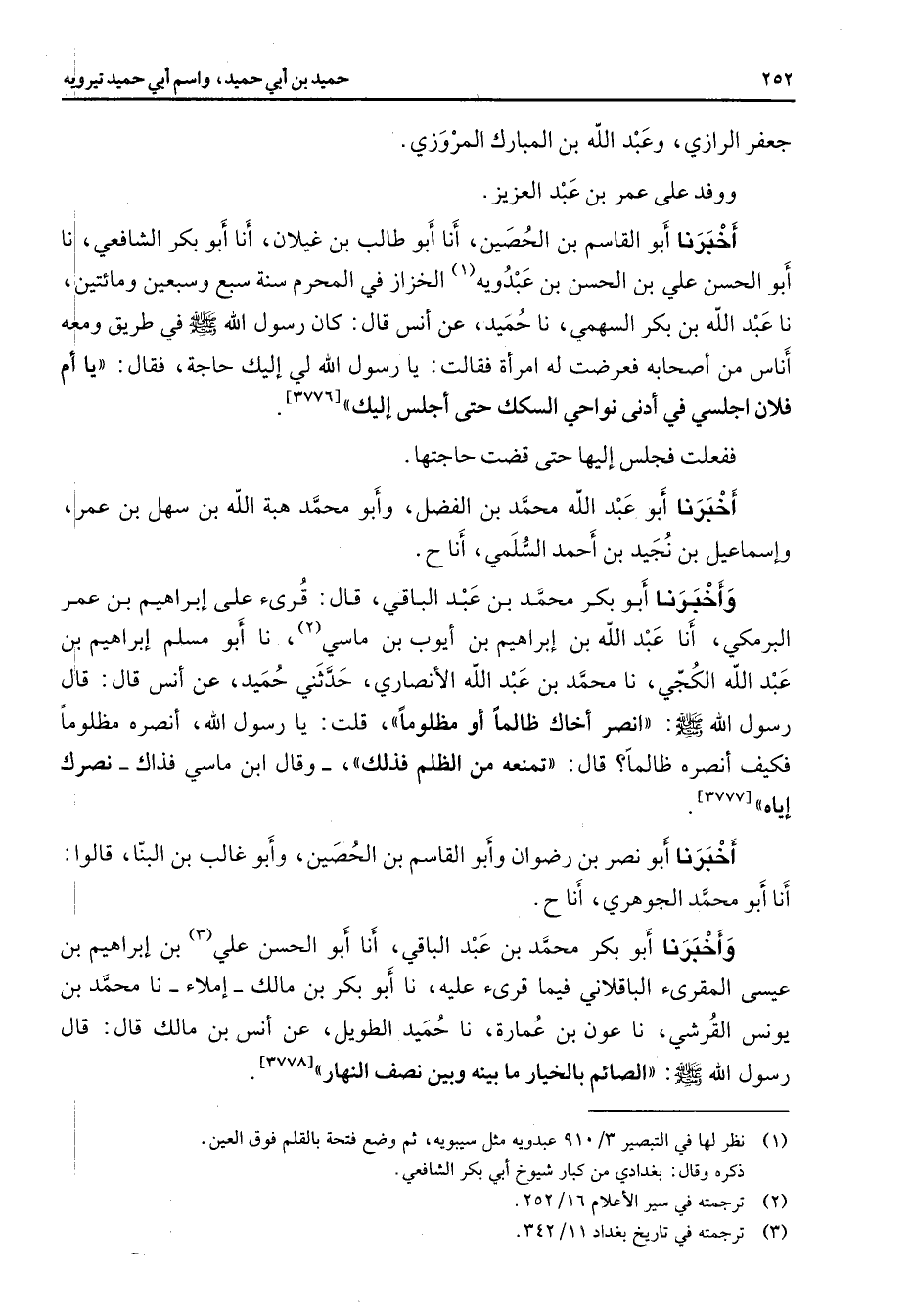 جعفر الرازي وعبد الله بن المبارك المروزي ووفد على عمر بن عبد العزيز أخبرنا أبو القاسم بن الحصين أنا أبو طالب بن غيلان أنا أبو بكر الشافعي نا أبو الحسن علي بن الحسن بن عبدويه (1) الخزاز في المحرم سنة سبع وسبعين ومائتين نا عبد الله بن بكر السهمي نا حميد عن أنس قال كان رسول الله (صلى الله عليه وسلم) في طريق ومعه أناس من أصحابه فعرضت له امرأة فقالت يا رسول الله لي إليك حاجة فقال يا أم فلان اجلسي في أدنى نواحي السكك حتى أجلس إليك (3776) ففعلت فجلس إليها حتى قضت حاجتها أخبرنا أبو عبد الله محمد بن الفضل وأبو محمد هبة الله بن سهل بن عمر وإسماعيل بن نجيد بن أحمد السلمي أنا ح وأخبرنا أبو بكر محمد بن عبد الباقي قال قرئ على إبراهيم بن عمر البرمكي أنا عبد الله بن إبراهيم بن أيوب بن ماسي (2) نا أبو مسلم إبراهيم بن عبد الله الكجي نا محمد بن عبد الله الأنصاري حدثني حميد عن أنس قال قال رسول الله (صلى الله عليه وسلم) انصر أخاك ظالما أو مظلوما قلت يا رسول الله أنصره مظلوما فكيف أنصره ظالما قال تمنعه من الظلم فذلك وقال ابن ماسي فذاك نصرك إياه (3777) أخبرنا أبو نصر بن رضوان وأبو القاسم بن الحصين وأبو غالب بن البنا قالوا أنا أبو محمد الجوهري أنا ح وأخبرنا أبو بكر محمد بن عبد الباقي أنا أبو الحسن علي (3) بن إبراهيم بن عيسى المقرئ الباقلاني فيما قرئ عليه نا أبو بكر بن مالك إملاء نا محمد بن يونس القرشي نا عون بن عمارة نا حميد الطويل عن أنس بن مالك قال قال رسول الله (صلى الله عليه وسلم) الصائم بالخيار ما بينه وبين نصف النهار (3778)