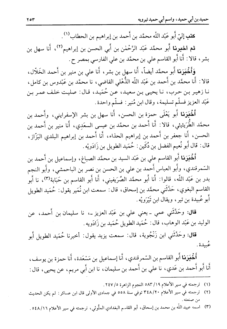 كتب إلي أبو عبد الله محمد بن أحمد بن إبراهيم بن الحطاب (1) ثم أخبرنا أبو محمد عبد الرحمن بن أبي الحسن بن إبراهيم (2) أنا سهل بن بشر قالا أنا أبو القاسم علي بن محمد بن علي الفارسي بمصر ح وأخبرنا أبو محمد أيضا أنا سهل بن بشر أنا علي بن منير بن أحمد الخلال قالا أنا محمد بن أحمد بن عبد الله الذهلي القاضي نا محمد بن عبدوس بن كامل نا زهير بن حرب نا يحيى بن سعيد عن حميد قال صليت خلف عمر بن عبد العزيز فسلم تسليمة وقال ابن منير فسلم واحدة أخبرنا أبو يعلى حمزة بن الحسن أنا سهل بن بشر الإسفرايني وأحمد بن محمد الطريثيثي قالا أنا أحمد بن محمد بن عيسى السعدي أنا منير بن أحمد بن الحسن أنا جعفر بن أحمد بن إبراهيم الحذاء أنا أحمد بن إبراهيم البلدي البزاز قال قال أبو نعيم الفضل بن دكين حميد الطويل بن زادويه أخبرنا أبو القاسم علي بن عبد السيد بن محمد الصباغ وإسماعيل بن أحمد بن السمرقندي وأبو العباس أحمد بن علي بن الحسن بن نصر بن الباحمشي وأبو النجم بدر بن عبد الله قالوا أنا أبو محمد الصريفيني أنا أبو القاسم بن حبابة (3) نا أبو القاسم البغوي حدثني محمد بن إسحاق قال سمعت ابن نمير يقول حميد الطويل أبو عبيدة بن تير ويقال ابن تيرويه قال وحدثني عمي يعني علي بن عبد العزيز نا سليمان بن أحمد عن الوليد بن عبد الوهاب قال حميد الطويل حميد بن زادويه قال وحدثني ابن زنجوية قال سمعت يزيد يقول أخبرنا حميد الطويل أبو عبيدة أخبرنا أبو القاسم بن السمرقندي أنا إسماعيل بن مسعدة أنا حمزة بن يوسف أنا أبو أحمد بن عدي نا علي بن أحمد بن سليمان نا ابن أبي مريم عن يحيى قال