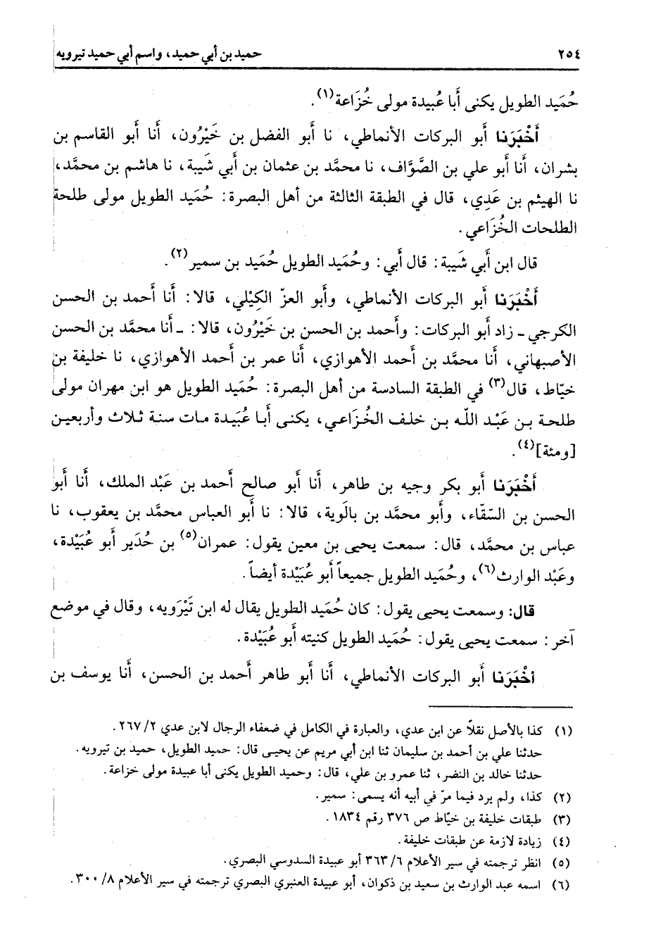 الأصبهاني أنا محمد بن أحمد الأهوازي أنا عمر بن أحمد الأهوازي نا خليفة بن خياط قال (3) في الطبقة السادسة من أهل البصرة حميد الطويل هو ابن مهران مولى طلحة بن عبد الله بن خلف الخزاعي يكنى أبا عبيدة مات سنة ثلاث وأربعين ومئة (4) أخبرنا أبو بكر وجيه بن طاهر أنا أبو صالح أحمد بن عبد الملك أنا أبو الحسن بن السقاء وأبو محمد بن بالوية قالا نا أبو العباس محمد بن يعقوب نا عباس بن محمد قال سمعت يحيى بن معين يقول عمران (5) بن حدير أبو عبيدة وعبد الوارث (6) وحميد الطويل جميعا أبو عبيدة أيضا قال وسمعت يحيى يقول كان حميد الطويل يقال له ابن تيرويه وقال في موضع آخر سمعت يحيى يقول حميد الطويل كنيته أبو عبيدة أخبرنا أبو البركات الأنماطي أنا أبو طاهر أحمد بن الحسن أنا يوسف بن