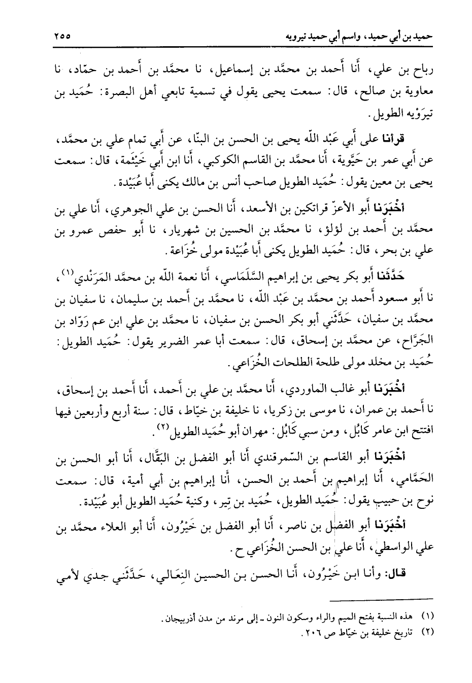 رباح بن علي أنا أحمد بن محمد بن إسماعيل نا محمد بن أحمد بن حماد نا معاوية بن صالح قال سمعت يحيى يقول في تسمية تابعي أهل البصرة حميد بن تيرويه الطويل قرأنا على أبي عبد الله يحيى بن الحسن بن البنا عن أبي تمام علي بن محمد عن أبي عمر بن حيوية أنا محمد بن القاسم الكوكبي أنا ابن أبي خيثمة قال سمعت يحيى بن معين يقول حميد الطويل صاحب أنس بن مالك يكنى أبا عبيدة أخبرنا أبو الأعز قراتكين بن الأسعد أنا الحسن بن علي الجوهري أنا علي بن محمد بن أحمد بن لؤلؤ نا محمد بن الحسين بن شهريار نا أبو حفص عمرو بن علي بن بحر قال حميد الطويل يكنى أبا عبيدة مولى خزاعة حدثنا أبو بكر يحيى بن إبراهيم السلماسي أنا نعمة الله بن محمد المرندي (1) نا أبو مسعود أحمد بن محمد بن عبد الله نا محمد بن أحمد بن سليمان نا سفيان بن محمد بن سفيان حدثني أبو بكر الحسن بن سفيان نا محمد بن علي ابن عم رواد بن الجراح عن محمد بن إسحاق قال سمعت أبا عمر الضرير يقول حميد الطويل حميد بن مخلد مولى طلحة الطلحات الخزاعي أخبرنا أبو غالب الماوردي أنا محمد بن علي بن أحمد أنا أحمد بن إسحاق نا أحمد بن عمران نا موسى بن زكريا نا خليفة بن خياط قال سنة أربع وأربعين فيها افتتح ابن عامر كابل ومن سبي كابل مهران أبو حميد الطويل (2) أخبرنا أبو القاسم بن السمرقندي أنا أبو الفضل بن البقال أنا أبو الحسن بن الحمامي أنا إبراهيم بن أحمد بن الحسن أنا إبراهيم بن أبي أمية قال سمعت نوح بن حبيب يقول حميد الطويل حميد بن تير وكنية حميد الطويل أبو عبيدة أخبرنا أبو الفضل بن ناصر أنا أبو الفضل بن خيرون أنا أبو العلاء محمد بن علي الواسطي أنا علي بن الحسن الخزاعي ح قال وأنا ابن خيرون أنا الحسن بن الحسين النعالي حدثني جدي لأمي
