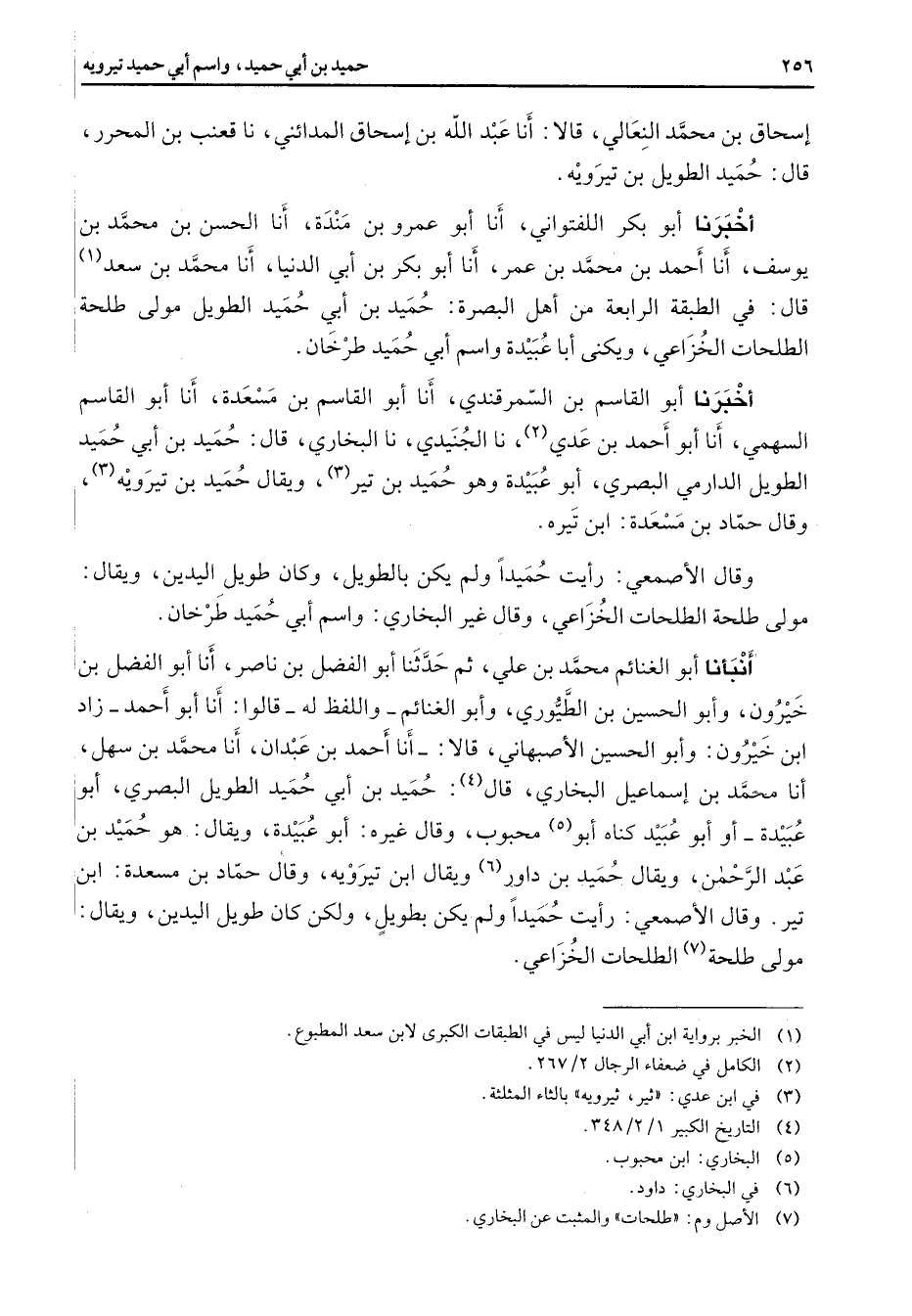 إسحاق بن محمد النعالي قالا أنا عبد الله بن إسحاق المدائني نا قعنب بن المحرر قال حميد الطويل بن تيرويه أخبرنا أبو بكر اللفتواني أنا أبو عمرو بن مندة أنا الحسن بن محمد بن يوسف أنا أحمد بن محمد بن عمر أنا أبو بكر بن أبي الدنيا أنا محمد بن سعد (1) قال في الطبقة الرابعة من أهل البصرة حميد بن أبي حميد الطويل مولى طلحة الطلحات الخزاعي ويكنى أبا عبيدة واسم أبي حميد طرخان أخبرنا أبو القاسم بن السمرقندي أنا أبو القاسم بن مسعدة أنا أبو القاسم السهمي أنا أبو أحمد بن عدي (2) نا الجنيدي نا البخاري قال حميد بن أبي حميد الطويل الدارمي البصري أبو عبيدة وهو حميد بن تير (3) ويقال حميد بن تيرويه (3) وقال حماد بن مسعدة ابن تيره وقال الأصمعي رأيت حميدا ولم يكن بالطويل وكان طويل اليدين ويقال مولى طلحة الطلحات الخزاعي وقال غير البخاري واسم أبي حميد طرخان أنبأنا أبو الغنائم محمد بن علي ثم حدثنا أبو الفضل بن ناصر أنا أبو الفضل بن خيرون وأبو الحسين بن الطيوري وأبو الغنائم واللفظ له قالوا أنا أبو أحمد زاد ابن خيرون وأبو الحسين الأصبهاني قالا أنا أحمد بن عبدان أنا محمد بن سهل أنا محمد بن إسماعيل البخاري قال (4) حميد بن أبي حميد الطويل البصري أبو عبيدة أو أبو عبيد كناه أبو (5) محبوب وقال غيره أبو عبيدة ويقال هو حميد بن عبد الرحمن ويقال حميد بن داور (6) ويقال ابن تيرويه وقال حماد بن مسعدة ابن تير وقال الأصمعي رأيت حميدا ولم يكن بطويل ولكن كان طويل اليدين ويقال مولى طلحة (7) الطلحات الخزاعي