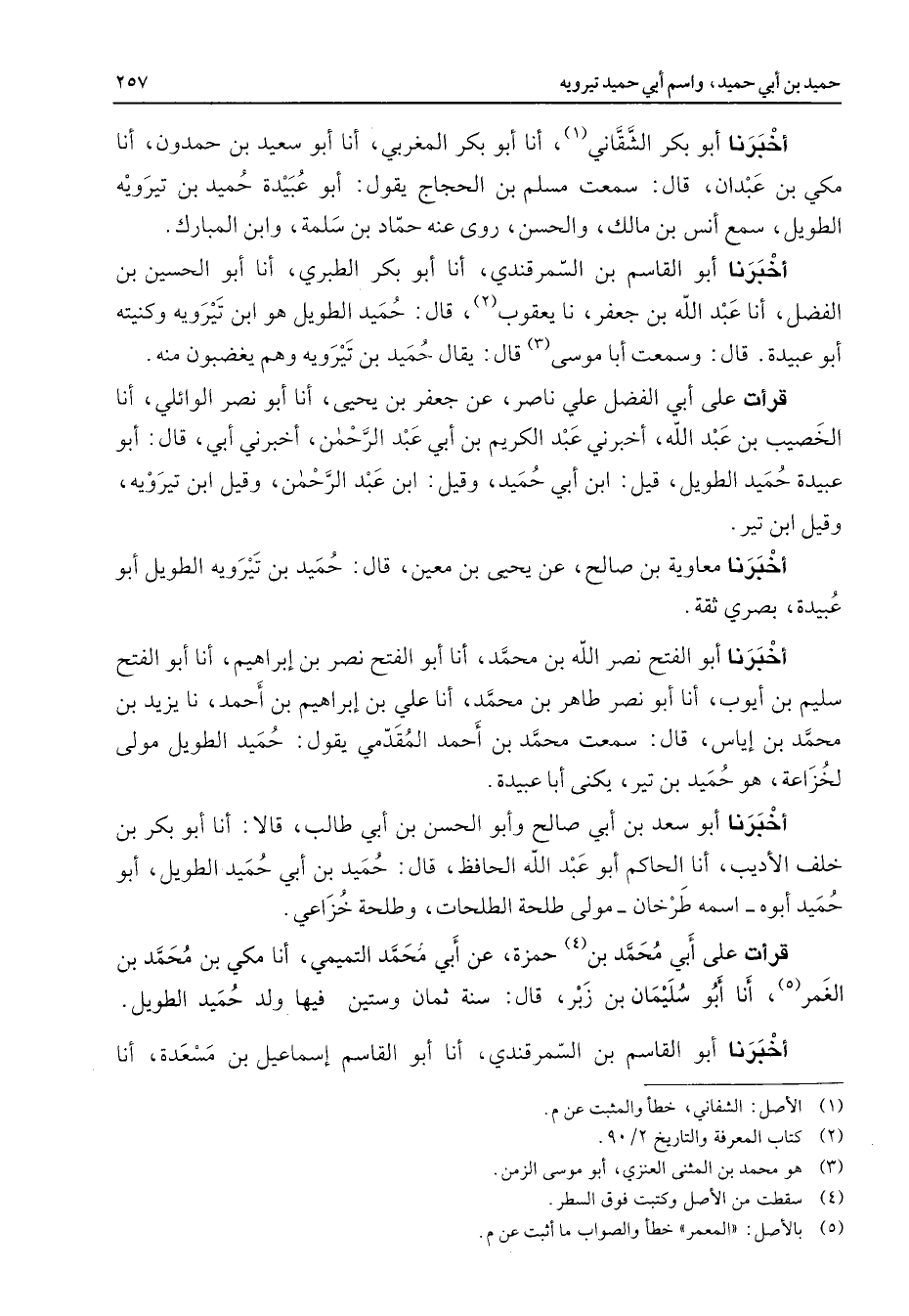 أخبرنا أبو بكر الشقاني (1) أنا أبو بكر المغربي أنا أبو سعيد بن حمدون أنا مكي بن عبدان قال سمعت مسلم بن الحجاج يقول أبو عبيدة حميد بن تيرويه الطويل سمع أنس بن مالك والحسن روى عنه حماد بن سلمة وابن المبارك أخبرنا أبو القاسم بن السمرقندي أنا أبو بكر الطبري أنا أبو الحسين بن الفضل أنا عبد الله بن جعفر نا يعقوب (2) قال حميد الطويل هو ابن تيرويه وكنيته أبو عبيدة قال وسمعت أبا موسى (3) قال يقال حميد بن تيرويه وهم يغضبون منه قرأت على أبي الفضل علي ناصر عن جعفر بن يحيى أنا أبو نصر الوائلي أنا الخصيب بن عبد الله أخبرني عبد الكريم بن أبي عبد الرحمن أخبرني أبي قال أبو عبيدة حميد الطويل قيل ابن أبي حميد وقيل ابن عبد الرحمن وقيل ابن تيرويه وقيل ابن تير أخبرنا معاوية بن صالح عن يحيى بن معين قال حميد بن تيرويه الطويل أبو عبيدة بصري ثقة أخبرنا أبو الفتح نصر الله بن محمد أنا أبو الفتح نصر بن إبراهيم أنا أبو الفتح سليم بن أيوب أنا أبو نصر طاهر بن محمد أنا علي بن إبراهيم بن أحمد نا يزيد بن محمد بن إياس قال سمعت محمد بن أحمد المقدمي يقول حميد الطويل مولى لخزاعة هو حميد بن تير يكنى أبا عبيدة أخبرنا أبو سعد بن أبي صالح وأبو الحسن بن أبي طالب قالا أنا أبو بكر بن خلف الأديب أنا الحاكم أبو عبد الله الحافظ قال حميد بن أبي حميد الطويل أبو حميد أبوه اسمه طرخان مولى طلحة الطلحات وطلحة الخزاعي قرأت على أبي محمد بن (4) حمزة عن أبي محمد التميمي أنا مكي بن محمد بن الغمر أنا أبو سليمان بن زبر قال سنة ثمان وستين فيها ولد حميد الطويل أخبرنا أبو القاسم بن السمرقندي أنا أبو القاسم إسماعيل بن مسعدة أنا