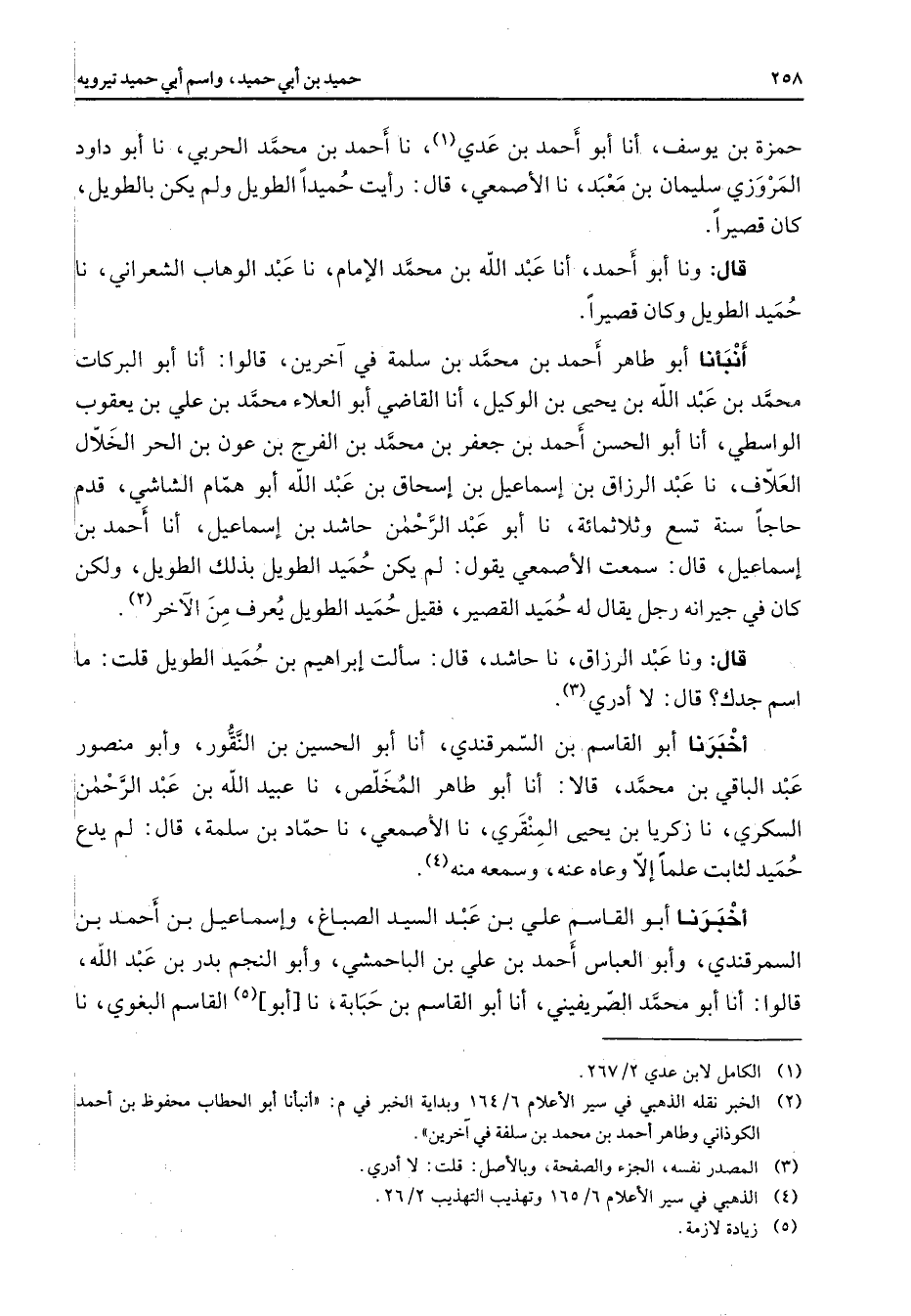 حمزة بن يوسف أنا أبو أحمد بن عدي (1) نا أحمد بن محمد الحربي نا أبو داود المروزي سليمان بن معبد نا الأصمعي قال رأيت حميدا الطويل ولم يكن بالطويل كان قصيرا قال ونا أبو أحمد أنا عبد الله بن محمد الإمام نا عبد الوهاب الشعراني نا حميد الطويل وكان قصيرا أنبأنا أبو طاهر أحمد بن محمد بن سلمة في آخرين قالوا أنا أبو البركات محمد بن عبد الله بن يحيى بن الوكيل أنا القاضي أبو العلاء محمد بن علي بن يعقوب الواسطي أنا أبو الحسن أحمد بن جعفر بن محمد بن الفرج بن عون بن الحر الخلال العلاف نا عبد الرزاق بن إسماعيل بن إسحاق بن عبد الله أبو همام الشاشي قدم حاجا سنة تسع وثلاثمائة نا أبو عبد الرحمن حاشد بن إسماعيل أنا أحمد بن إسماعيل قال سمعت الأصمعي يقول لم يكن حميد الطويل بذلك الطويل ولكن كان في جيرانه رجل يقال له حميد القصير فقيل حميد الطويل يعرف من الآخر (2) قال ونا عبد الرزاق نا حاشد قال سألت إبراهيم بن حميد الطويل قلت ما اسم جدك قال لا أدري (3) أخبرنا أبو القاسم بن السمرقندي أنا أبو الحسين بن النقور وأبو منصور عبد الباقي بن محمد قالا أنا أبو طاهر المخلص نا عبيد الله بن عبد الرحمن السكري نا زكريا بن ح ح يحيى المنقري نا الأصمعي نا حماد بن سلمة قال لم يدع حميد لثابت علما إلا وح عاه عنه وسمعه منه (4) أخبرنا أبو القاسم علي بن عبد السيد الصباغ وإسماعيل بن أحمد بن السمرقندي وأبو العباس أحمد بن علي بن الباحمشي وأبو النجم بدر بن عبد الله قالوا أنا أبو محمد الصريفيني أنا أبو (5) القاسم بن حبابة نا أبو القاسم البغوي نا