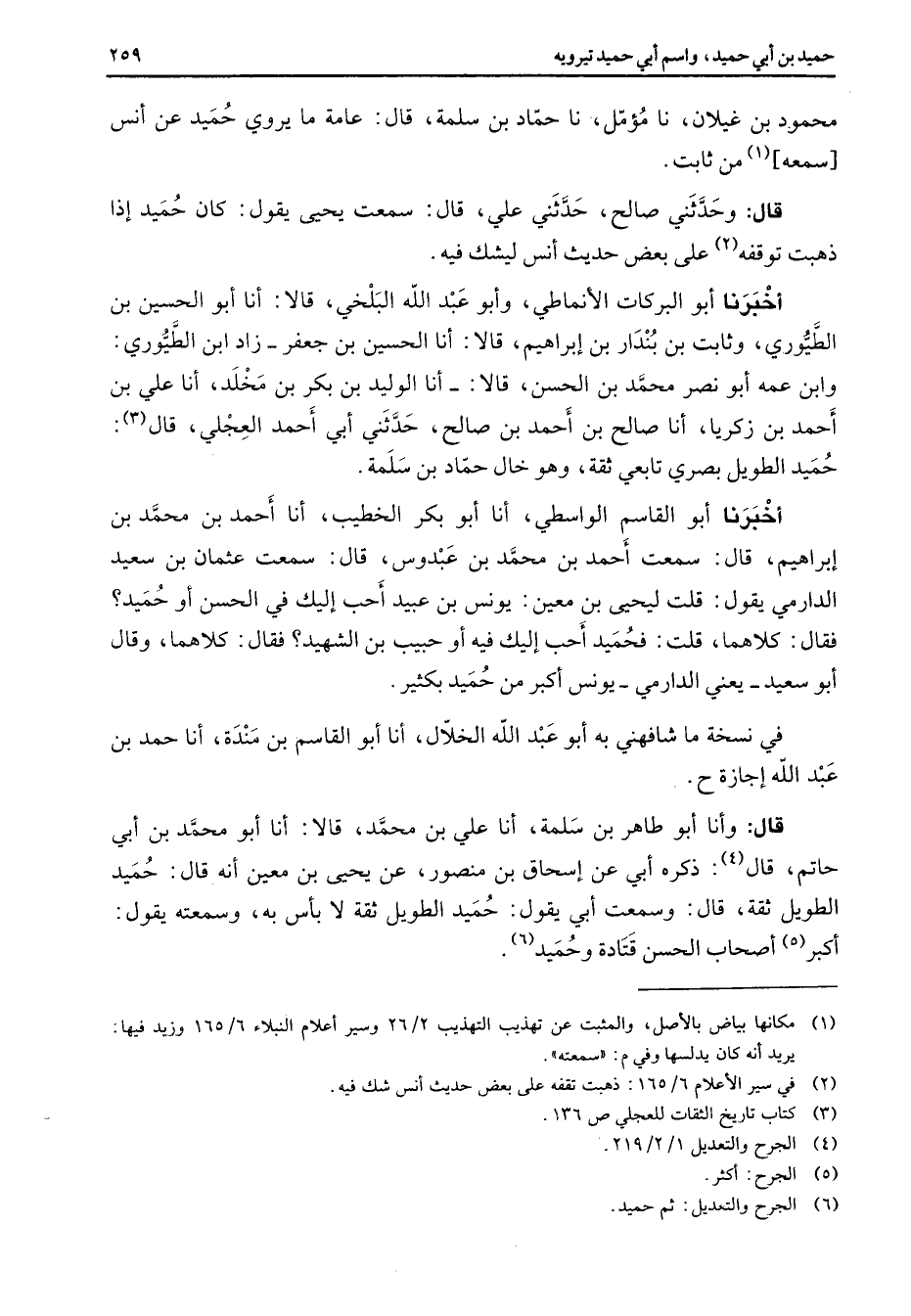 محمود بن غيلان نا مؤمل نا حماد بن سلمة قال عامة ما يروي حميد عن أنس سمعه (1) من ثابت قال وحدثني صالح حدثني علي قال سمعت يحيى يقول كان حميد إذا ذهبت توقفه (2) على بعض حديث أنس ليشك فيه أخبرنا أبو البركات الأنماطي وأبو عبد الله البلخي قالا أنا أبو الحسين بن الطيوري وثابت بن بندار بن إبراهيم قالا أنا الحسين بن جعفر زاد ابن الطيوري وابن عمه أبو نصر محمد بن الحسن قالا أنا الوليد بن بكر بن مخلد أنا علي بن أحمد بن زكريا أنا صالح بن أحمد بن صالح حدثني أبي أحمد العجلي قال (3) حميد الطويل بصري تابعي ثقة وهو خال حماد بن سلمة أخبرنا أبو القاسم الواسطي أنا أبو بكر الخطيب أنا أحمد بن محمد بن إبراهيم قال سمعت أحمد بن محمد بن عبدوس قال سمعت عثمان بن سعيد الدارمي يقول قلت ليحيى بن معين يونس بن عبيد أحب إليك في الحسن أو حميد فقال كلاهما قلت فحميد أحب إليك فيه أو حبيب بن الشهيد فقال كلاهما وقال أبو سعيد يعني الدارمي يونس أكبر من حميد بكثير في نسخة ما شافهني به أبو عبد الله الخلال أنا أبو القاسم بن مندة أنا حمد بن عبد الله إجازة ح قال وأنا أبو طاهر بن سلمة أنا علي بن محمد قالا أنا أبو محمد بن أبي حاتم قال ذكره أبي عن إسحاق بن منصور عن يحيى بن معين أنه قال حميد الطويل ثقة قال وسمعت أبي يقول حميد الطويل ثقة لا بأس به وسمعته يقول أكبر (5) أصحاب الحسن قتادة وحميد (6)