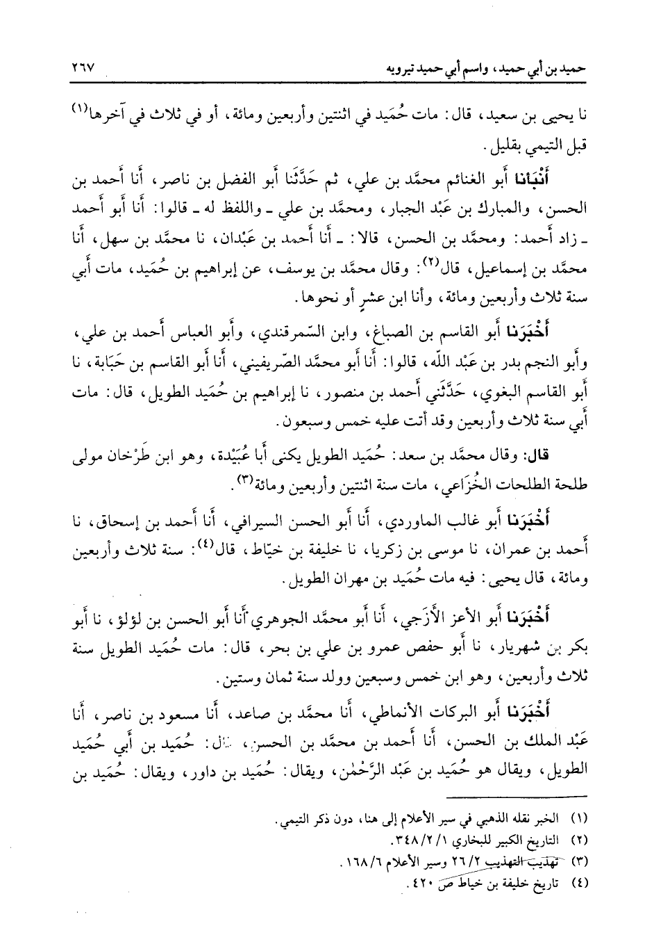 نا يحيى بن سعيد قال مات حميد في اثنتين وأربعين ومائة أو في ثلاث في آخرها (1) قبل التيمي بقليل أنبأنا أبو الغنائم محمد بن علي ثم حدثنا أبو الفضل بن ناصر أنا أحمد بن الحسن والمبارك بن عبد الجبار ومحمد بن علي واللفظ له قالوا أنا أبو أحمد زاد أحمد ومحمد بن الحسن قالا أنا أحمد بن عبدان نا محمد بن سهل أنا محمد بن إسماعيل قال (2) وقال محمد بن يوسف عن إبراهيم بن حميد مات أبي سنة ثلاث وأربعين ومائة وأنا ابن عشر أو نحوها أخبرنا أبو القاسم بن الصباغ وابن السمرقندي وأبو العباس أحمد بن علي وأبو النجم بدر بن عبد الله قالوا أنا أبو محمد الصريفيني أنا أبو القاسم بن حبابة نا أبو القاسم البغوي حدثني أحمد بن منصور نا إبراهيم بن حميد الطويل قال مات أبي سنة ثلاث وأربعين وقد أتت عليه خمس وسبعون قال وقال محمد بن سعد حميد الطويل يكنى أبا عبيدة وهو ابن طرخان مولى طلحة الطلحات الخزاعي مات سنة اثنتين وأربعين ومائة (3) أخبرنا أبو غالب الماوردي أنا أبو الحسن السيرافي أنا أحمد بن إسحاق نا أحمد بن عمران نا موسى بن زكريا نا خليفة بن خياط قال (4) سنة ثلاث وأربعين ومائة قال يحيى فيه مات حميد بن مهران الطويل أخبرنا أبو الأعز الأزجي أنا أبو محمد الجوهري أنا أبو الحسن بن لؤلؤ نا أبو بكر بن شهريار نا أبو حفص عمرو بن علي بن بحر قال مات حميد الطويل سنة ثلاث وأربعين وهو ابن خمس وسبعين وولد سنة ثمان وستين أخبرنا أبو البركات الأنماطي أنا محمد بن صاعد أنا مسعود بن ناصر أنا عبد الملك بن الحسن أنا أحمد بن محمد بن الحسن قال حميد بن أبي حميد الطويل ويقال هو حميد بن عبد الرحمن ويقال حميد بن داور ويقال حميد بن