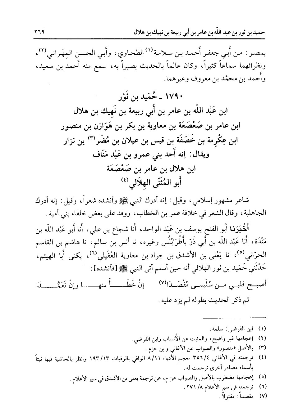1790 - حميد بن ثور ابن عبد الله بن عامر بن أبي ربيعة بن نهيك بن هلال ابن عامر بن صعصعة بن معاوية بن بكر بن هوازن بن منصور ابن عكرمة بن خصفة بن قيس بن عيلان بن مضر (3) بن نزار ويقال إنه أحد بني عمرو بن عبد مناف ابن هلال بن عامر بن صعصعة أبو المثنى الهلالي (4) شاعر مشهور إسلامي وقيل إنه أدرك النبي (صلى الله عليه وسلم) وأنشده شعرا وقيل إنه أدرك الجاهلية وقال الشعر في خلافة عمر بن الخطاب ووفد على بعض خلفاء بني أمية أخبرنا أبو الفتح يوسف بن عبد الواحد أنا شجاع بن علي أنا أبو عبد الله بن مندة أنا عبد الله بن أبي ذر بأطرابلس وغيره نا أنس بن سالم نا هاشم بن القاسم الحراني (5) نا يعلى بن الأشدق بن جراد بن معاوية العقيلي (6) يكنى أبا الهيثم حدثني حميد بن ثور الهلالي أنه حين أسلم أتى النبي (صلى الله عليه وسلم) فأنشده * أصبح قلبي من سليمى مقصدا (7) * إن خطأ منها وإن تعمدا * ثم ذكر الحديث بطوله لم يزد عليه