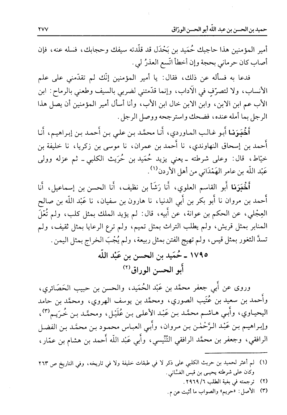 1795 - حميد بن الحسن بن عبد الله أبو الحسن الوراق (2) وروى عن أبي جعفر محمد بن عبد الحميد والحسن بن حبيب الحصائري وأحمد بن سعيد بن عتيب الصوري ومحمد بن يوسف الهروي ومحمد بن حامد اليحياوي وأبي هاشم محمد بن عبد الأعلى بن عليل ومحمد بن خريم (3) وإبراهيم بن عبد الرحمن بن مروان وأبي العباس محمود بن محمد بن الفضل الرافقي وجعفر بن محمد الرافقي التنيسي وأبي عبد الله أحمد بن هشام بن عمار
