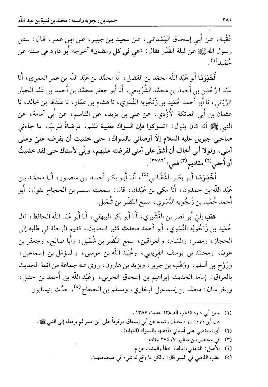 عقبة عن أبي إسحاق الهمداني عن سعيد بن جبير عن ابن عمر قال سئل رسول الله (صلى الله عليه وسلم) عن ليلة القدر فقال هي في كل رمضان ح أخرجه أبو داود في سننه عن حميد (1) أخبرنا أبو عبد الله محمد بن الفضل أنا محمد بن عبد الله بن عمر العمري أنا عبد الرحمن بن أحمد بن محمد الشريحي أنا أبو جعفر محمد بن أحمد بن عبد الجبار الرياني نا أبو أحمد حميد بن زنجويه النسوي نا هشام بن عمار نا صدقة بن خالد نا عثمان بن أبي العاتكة الأزدي عن علي بن يزيد عن القاسم عن أبي أمامة عن النبي (صلى الله عليه وسلم) أنه كان يقول تسوكوا فإن السواك مطيبة للفم مرضاة للرب ما جاءني صاحبي جبريل عليه السلام إلا أوصاني بالسواك حتى خشيت أن يفرضه علي وعلى أمتي ولولا أني أخاف أن أشق على أمتي لفرضته عليهم وإني لأستاك حتى لقد خشيت أن أحفي (2) مقاديم (3) فمي (3782) أخبرنا أبو بكر الشقاني (4) أنا أبو بكر أحمد بن منصور أنا محمد بن عبد الله بن حمدون أنا مكي بن عبدان قال سمعت مسلم بن الحجاج يقول أبو أحمد حميد بن زنجويه النسوي سمع النضر بن شميل كتب إلي أبو نصر بن القشيري أنا أبو بكر البيهقي أنا أبو عبد الله الحافظ قال حميد بن زنجويه النسوي أبو أحمد محدث كثير الحديث قديم الرحلة في طلبه إلى الحجاز ومصر والشام والعراقين سمع النضر بن شميل وأبا صالح وجعفر بن عون ومحمد بن يوسف الفريابي وعبيد الله بن موسى والمؤمل بن إسماعيل وروح بن أسلم ووهب بن جرير ويزيد بن هارون روى عنه جماعة من أئمة الحديث بالعراق إماما الحديث إبراهيم بن إسحاق الحربي وعبد الله بن أحمد بن حنبل وبخراسان محمد بن إسماعيل البخاري ومسلم بن الحجاج (5) حدث بنيسابور