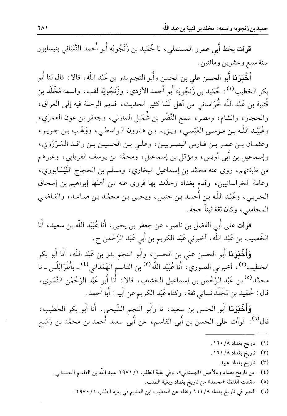 قرأت بخط أبي عمرو المستملي نا حميد بن زنجويه أبو أحمد النسائي بنيسابور سنة سبع وعشرين ومائتين أخبرنا أبو الحسن علي بن الحسن وأبو النجم بدر بن عبد الله قالا قال لنا أبو بكر الخطيب (1) حميد بن زنجويه أبو أحمد الأزدي وزنجويه لقب واسمه مخلد بن قتيبة بن عبد الله خراساني من أهل نسا كثير الحديث قديم الرحلة فيه إلى العراق والحجاز والشام ومصر سمع النضر بن شميل المازني وجعفر بن عون العمري وعبيد الله بن موسى العبسي ويزيد بن هارون الواسطي ووهب بن جرير وعثمان بن عمر بن فارس البصريين وعلي بن الحسين بن واقد المروزي وإسماعيل بن أبي أويس ومؤمل بن إسماعيل ومحمد بن يوسف الفريابي وغيرهم من طبقتهم روى عنه محمد بن إسماعيل البخاري ومسلم بن الحجاج النيسابوري وعامة الخراسانيين وقدم بغداد وحدث بها فروى عنه من أهلها إبراهيم بن إسحاق الحربي وعبد الله بن أحمد بن حنبل ويحيى بن محمد بن صاعد والقاضي المحاملي وكان ثقة ثبتا حجة قرأت على أبي الفضل بن ناصر عن جعفر بن يحيى أنا عبيد الله بن سعيد أنا الخصيب بن عبد الله أخبرني عبد الكريم بن أبي عبد الرحمن ح وأخبرنا أبو الحسن علي بن الحسن وأبو النجم بدر بن عبد الله أنا أبو بكر الخطيب أخبرني الصوري أنا عبيد الله (3) بن القاسم الهمذاني (4) بأطرابلس نا محمد بن عبد الرحمن بن إسماعيل الخشاب قالا أنا أبو عبد الرحمن النسوي قال حميد بن مخلد نسائي ثقة وكناه عبد الكريم عن أبيه أبا أحمد أخبرنا أبو الحسن بن سعيد نا وأبو النجم الشيحي أنا أبو بكر الخطيب قال (6) ذقرأت على الحسن بن أبي القاسم عن أبي سعيد أحمد بن محمد بن رميح
