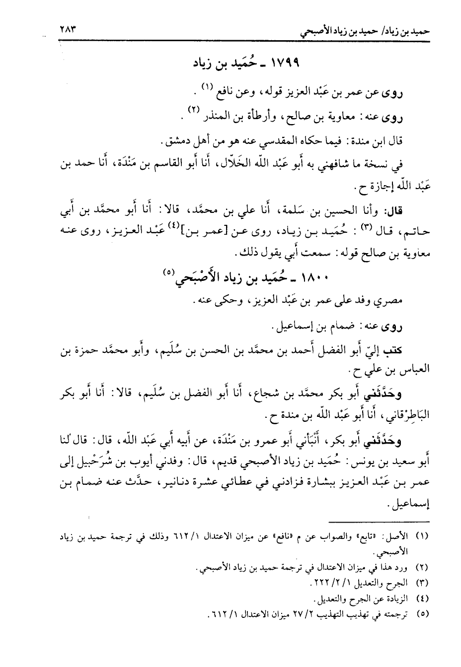 1800 - حميد بن زياد الأصبحي (5) مصري وفد على عمر بن عبد العزيز وحكى عنه روى عنه ضمام بن إسماعيل كتب إلي أبو الفضل أحمد بن محمد بن الحسن بن سليم وأبو محمد حمزة بن العباس بن علي ح وحدثني أبو بكر محمد بن شجاع أنا أبو الفضل بن سليم قالا أنا أبو بكر الباطرقاني أنا أبو عبد الله بن مندة ح وحدثني أبو بكر أنبأني أبو عمرو بن مندة عن أبيه أبي عبد الله قال قال لنا أبو سعيد بن يونس حميد بن زياد الأصبحي قديم قال وفدني أيوب بن شرحبيل إلى عمر بن عبد العزيز ببشارة فزادني في عطائي عشرة دنانير حدث عنه ضمام بن إسماعيل