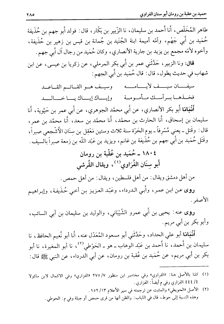 1804 - حميد بن عقبة بن رومان أبو سنان الفراوي (1) ويقال القرشي من أهل دمشق ويقال من أهل فلسطين ويقال من أهل حمص روى عن ابن عمر وأبي الدرداء وعبد العزيز بن أخي حذيفة وإبراهيم الأصفر روى عنه يحيى بن أبي عمرو الشيباني والوليد بن سليمان بن أبي السائب وأبو بكر بن أبي مريم أنبأنا أبو علي الحداد وحدثني أبو مسعود المعدل عنه أنا أبو نعيم الحافظ نا سليمان بن أحمد نا أحمد بن عبد الوهاب هو الحوطي نا أبو المغيرة نا أبو بكر بن أبي مريم عن حميد بن عقبة بن رومان عن أبي الدرداء عن النبي (صلى الله عليه وسلم) قال