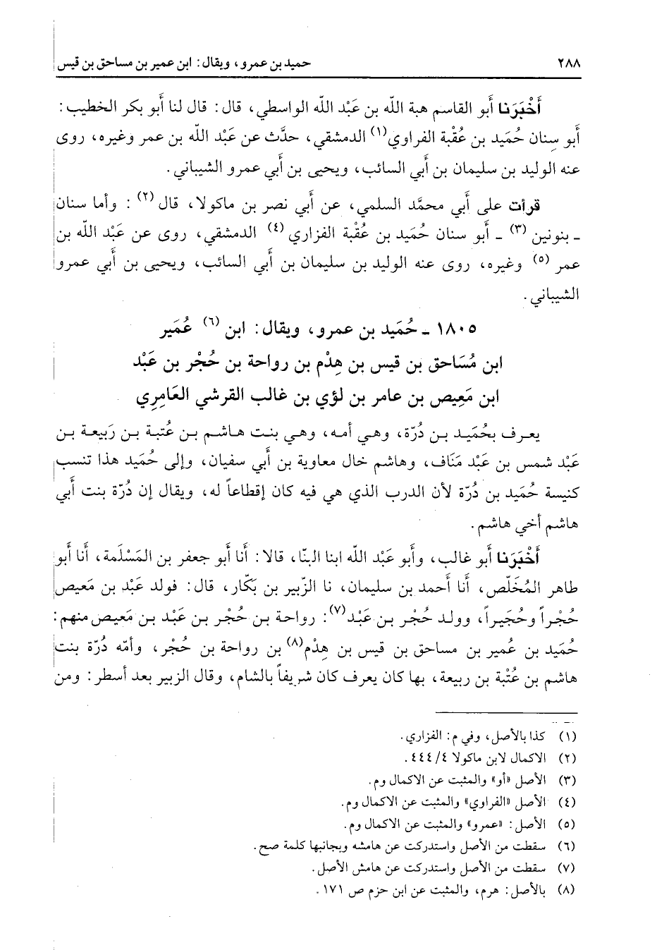 1805 - حميد بن عمرو ويقال ابن (6) عمير ابن مساحق بن قيس بن هدم بن رواحة بن حجر بن عبد ابن معيص بن عامر بن لؤي بن غالب القرشي العامري يعرف بحميد بن درة وهي أمه وهي بنت هاشم بن عتبة بن ربيعة بن عبد شمس بن عبد مناف وهاشم خال معاوية بن أبي سفيان وإلى حميد هذا تنسب كنيسة حميد بن درة لأن الدرب الذي هي فيه كان إقطاعا له ويقال إن درة بنت أبي هاشم أخي هاشم أخبرنا أبو غالب وأبو عبد الله ابنا البنا قالا أنا أبو جعفر بن المسلمة أنا أبو طاهر المخلص أنا أحمد بن سليمان نا الزبير بن بكار قال فولد عبد بن معيص حجرا وحجيرا وولد حجر بن عبد (7) رواحة بن حجر بن عبد بن معيص منهم حميد بن عمير بن مساحق بن قيس بن هدم (8) بن رواحة بن حجر وأمه درة بنت هاشم بن عتبة بن ربيعة بها كان يعرف كان شريفا بالشام وقال الزبير بعد أسطر ومن
