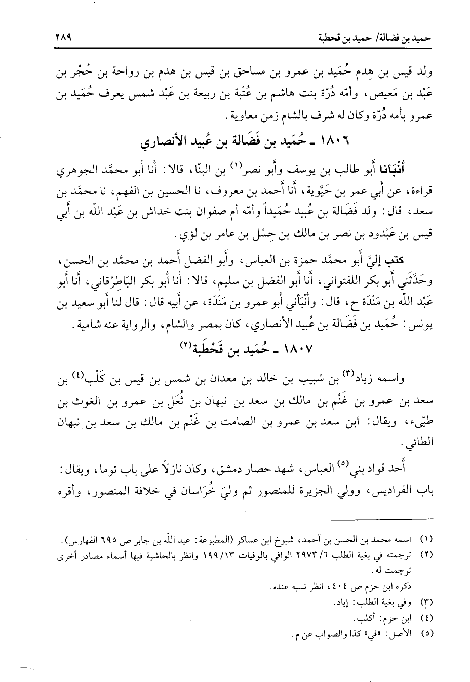 1807 - حميد بن قحطبة (2) واسمه زياد (3) بن شبيب بن خالد بن معدان بن شمس بن قيس بن كلب (4) بن سعد بن عمرو بن غنم بن مالك بن سعد بن نبهان بن ثعل بن عمرو بن الغوث بن طيئ ويقال ابن سعد بن عمرو بن الصامت بن غنم بن مالك بن سعد بن نبهان الطائي أحد قواد بني (5) العباس شهد حصار دمشق وكان نازلا على باب توما ويقال باب الفراديس وولي الجزيرة للمنصور ثم ولي خراسان في خلافة المنصور وأقره