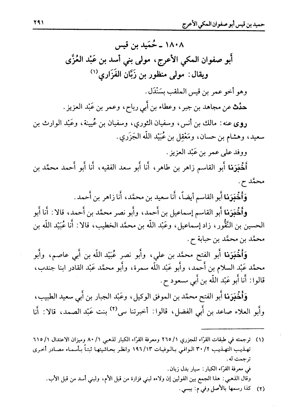 1808 - حميد بن قيس أبو صفوان المكي الأعرج مولى بني أسد بن عبد العزى ويقال مولى منظور بن زبان الفزاري (1) وهو أخو عمر بن قيس الملقب بسندل حدث عن مجاهد بن جبر وعطاء بن أبي رباح وعمر بن عبد العزيز روى عنه مالك بن أنس وسفيان الثوري وسفيان بن عيينة وعبد الوارث بن سعيد وهشام بن حسان ومعقل بن عبيد الله الجزري ووفد على عمر بن عبد العزيز أخبرنا أبو القاسم زاهر بن طاهر أنا أبو سعد الفقيه أنا أبو أحمد محمد بن محمد ح وأخبرنا أبو القاسم أيضا أنا سعيد بن محمد أنا زاهر بن أحمد وأخبرنا أبو القاسم إسماعيل بن أحمد وأبو نصر محمد بن أحمد قالا أنا أبو الحسين بن النقور زاد إسماعيل وعبد الله بن محمد الخطيب قالا أنا عبيد الله بن محمد بن محمد بن حبابة ح وأخبرنا أبو الفتح محمد بن علي وأبو نصر عبيد الله بن أبي عاصم وأبو محمد عبد السلام بن أحمد وأبو عبد الله سمرة وأبو محمد عبد القادر ابنا جندب قالوا أنا أبو عبد الله بن أبي مسعود ح وأخبرنا أبو الفتح محمد بن الموفق الوكيل وعبد الجبار بن أبي سعيد الطبيب وأبو العلاء صاعد بن أبي الفضل قالوا أخبرتنا مى (2) بنت عبد الصمد قالا أنا