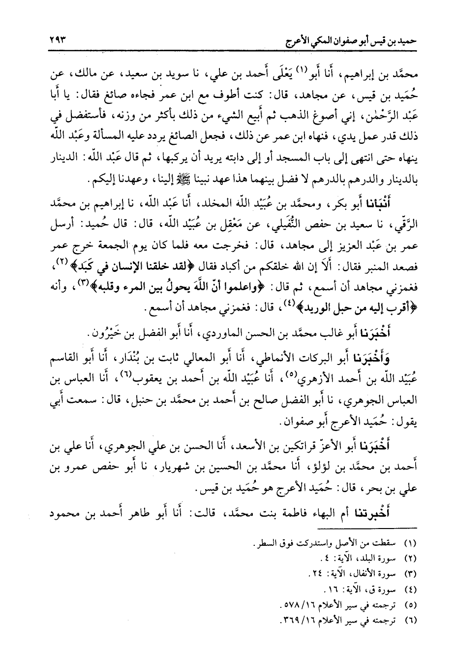 محمد بن إبراهيم أنا أبو (1) يعلى أحمد بن علي نا سويد بن سعيد عن مالك عن حميد بن قيس عن مجاهد قال كنت أطوف مع ابن عمر فجاءه صائغ فقال يا أبا عبد الرحمن إني أصوغ الذهب ثم أبيع الشئ من ذلك بأكثر من وزنه فأستفضل في ذلك قدر عمل يدي فنهاه ابن عمر عن ذلك فجعل الصائغ يردد عليه المسألة وعبد الله ينهاه حتى انتهى إلى باب المسجد أو إلى دابته يريد أن يركبها ثم قال عبد الله الدينار بالدينار والدرهم بالدرهم لا فضل بينهما هذا عهد نبينا (صلى الله عليه وسلم) إلينا وعهدنا إليكم أنبأنا أبو بكر ومحمد بن عبيد الله المخلد أنا عبد الله نا إبراهيم بن محمد الرقي نا سعيد بن حفص النفيلي عن معقل بن عبيد الله قال قال حميد أرسل عمر بن عبد العزيز إلى مجاهد قال فخرجت معه فلما كان يوم الجمعة خرج عمر فصعد المنبر فقال ألا إن الله خلقكم من أكباد فقال " لقد خلقنا الإنسان في كبد " (2) فغمرني مجاهد أن أسمع ثم قال " واعلموا أن الله يحول بين المرء وقلبه " (3) وأنه " أقرب إليه من حبل الوريد " (4) قال فغمرني مجاهد أن أسمع أخبرنا أبو غالب محمد بن الحسن الماوردي أنا أبو الفضل بن خيرون وأخبرنا أبو البركات الأنماطي أنا أبو المعالي ثابت بن بندار أنا أبو القاسم عبيد الله بن أحمد الأزهري (5) أنا عبيد الله بن أحمد بن يعقوب (6) أنا العباس بن العباس الجوهري نا أبو الفضل صالح بن أحمد بن محمد بن حنبل قال سمعت أبي يقول حميد الأعرج أبو صفوان أخبرنا أبو الأعز قراتكين بن الأسعد أنا الحسن بن علي الجوهري أنا علي بن أحمد بن محمد بن لؤلؤ أنا محمد بن الحسين بن شهريار نا أبو حفص عمرو بن علي بن بحر قال حميد الأعرج هو حميد بن قيس أخبرنا أم البهاء فاطمة بنت محمد قالت أنا أبو طاهر أحمد بن محمود