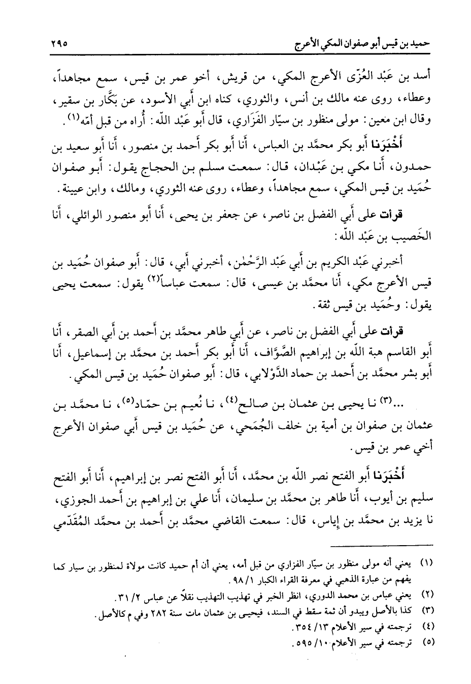 أسد بن عبد العزى الأعرج المكي من قريش أخو عمر بن قيس سمع مجاهدا وعطاء روى عنه مالك بن أنس والثوري كناه ابن أبي الأسود عن بكار بن سقير وقال ابن معين مولى منظور بن سيار الفزاري قال أبو عبد الله أراه من قبل أمه (1) أخبرنا أبو بكر محمد بن العباس أنا أبو بكر أحمد بن منصور أنا أبو سعيد بن حمدون أنا مكي بن عبدان قال سمعت مسلم بن الحجاج يقول أبو صفوان حميد بن قيس المكي سمع مجاهدا وعطاء روى عنه الثوري ومالك وابن عيينة قرأت على أبي الفضل بن ناصر عن جعفر بن يحيى أنا أبو منصور الوائلي أنا الخصيب بن عبد الله أخبرني عبد الكريم بن أبي عبد الرحمن أخبرني أبي قال أبو صفوان حميد بن قيس الأعرج مكي أنا محمد بن عيسى قال سمعت عباسا (2) يقول سمعت يحيى يقول وحميد بن قيس ثقة قرأت على أبي الفضل بن ناصر عن أبي طاهر محمد بن أحمد بن أبي الصقر أنا أبو القاسم هبة الله بن إبراهيم الصواف أنا أبو بكر أحمد بن محمد بن إسماعيل أنا أبو بشر محمد بن أحمد بن حماد الدولابي قال أبو صفوان حميد بن قيس المكي
