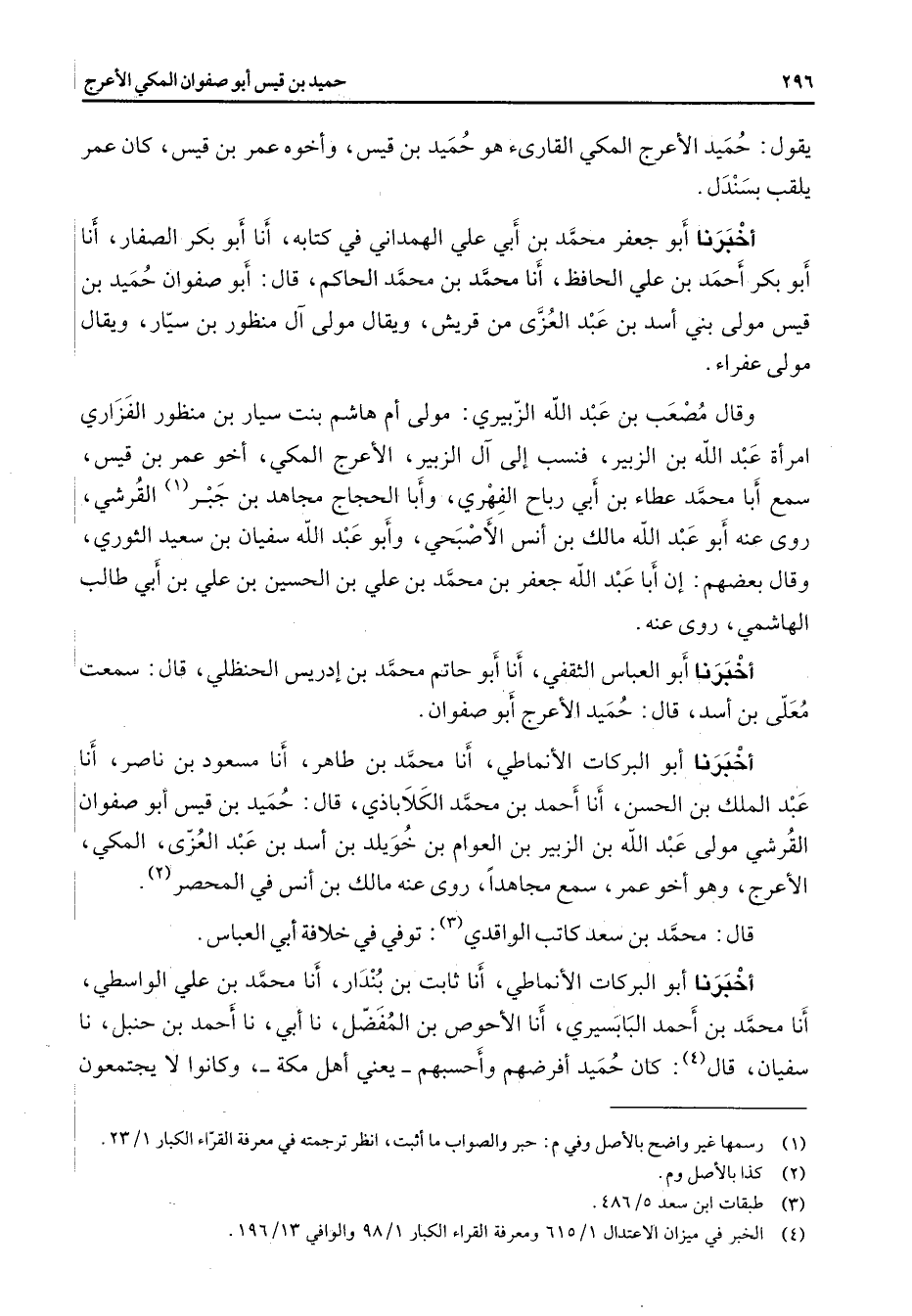 يقول حميد الأعرج المكي القارئ هو حميد بن قيس وأخوه عمر بن قيس كان عمر يلقب بسندل أخبرنا أبو جعفر محمد بن أبي علي الهمداني في كتابه أنا أبو بكر الصفار أنا أبو بكر أحمد بن علي الحافظ أنا محمد بن محمد الحاكم قال أبو صفوان حميد بن قيس مولى بني أسد بن عبد العزى من قريش ويقال مولى آل منظور بن سيار ويقال مولى عفراء وقال مصعب بن عبد الله الزبيري مولى أم هاشم بنت سيار بن منظور الفزاري امرأة عبد الله بن الزبير فنسب إلى آل الزبير الأعرج المكي أخو عمر بن قيس سمع أبا محمد عطاء بن أبي رباح الفهري وأبا الحجاج مجاهد بن جبر (1) القرشي روى عنه أبو عبد الله مالك بن أنس الأصبحي وأبو عبد الله سفيان بن سعيد الثوري وقال بعضهم إن أبا عبد الله جعفر بن محمد بن علي بن الحسين بن علي بن أبي طالب الهاشمي روى عنه أخبرنا أبو العباس الثقفي أنا أبو حاتم محمد بن إدريس الحنظلي قال سمعت معلى بن أسد قال حميد الأعرج أبو صفوان أخبرنا أبو البركات الأنماطي أنا محمد بن طاهر أنا مسعود بن ناصر أنا عبد الملك بن الحسن أنا أحمد بن محمد الكلاباذي قال حميد بن قيس أبو صفوان القرشي مولى عبد الله بن الزبير بن العوام بن خويلد بن أسد بن عبد العزى المكي الأعرج وهو أخو عمر سمع مجاهدا روى عنه مالك بن أنس في المحصر (2) قال محمد بن سعد كاتب الواقدي (3) توفي في خلافة أبي العباس أخبرنا أبو البركات الأنماطي أنا ثابت بن بندار أنا محمد بن علي الواسطي أنا محمد بن أحمد البابسيري أنا الأحوص بن المفضل نا أبي نا أحمد بن حنبل نا سفيان قال (4) كان حميد أفرضهم وأحسبهم يعني أهل مكة وكانوا لا يجتمعون