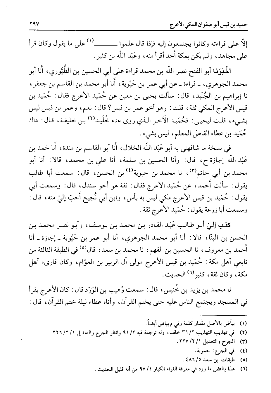 إلا على قراءته وكانوا يجتمعون إليه فإذا قال علموا (1) على ما يقول وكان قرأ على مجاهد ولم يكن بمكة أحد أقرأ منه وعبد الله بن كثير أخبرنا أبو الفتح نصر الله بن محمد قراءة على أبي الحسين بن الطيوري أنا أبو محمد الجوهري قراءة عن أبي عمر بن حيوية أنا أبو محمد بن القاسم بن جعفر نا إبراهيم بن الجنيد قال سألت يحيى بن معين عن حميد الأعرج فقال حميد بن قيس الأعرج المكي ثقة قلت وهو أخو عمر بن قيس قال نعم وعمر بن قيس ليس بشئ قلت ليحيى فحميد الآخر الذي روى عنه خليد (2) بن خليفة قال ذاك حميد بن عطاء القاص المعلم ليس بشئ في نسخة ما شافهني به أبو عبد الله الخلال أنا أبو القاسم بن مندة أنا حمد بن عبد الله إجازة ح قال وأنا الحسين بن سلمة أنا علي بن محمد قالا أنا أبو محمد بن أبي حاتم (3) نا محمد بن حيوية (4) بن الحسن قال سمعت أبا طالب يقول سألت أحمد عن حميد الأعرج فقال ثقة هو أخو سندل قال وسمعت أبي يقول حميد بن قيس الأعرج مكي ليس به بأس وابن أبي نجيح أحب إلي منه قال وسمعت أبا زرعة يقول حميد الأعرج ثقة كتب إلي أبو طالب عبد القادر بن محمد بن يوسف وأبو نصر محمد بن الحسن بن البنا قالا أنا أبو محمد الجوهري أنا أبو عمر بن حيوية إجازة أنا أحمد بن معروف نا الحسين بن الفهم نا محمد بن سعد قال (5) في الطبقة الثالثة من تابعي أهل مكة حميد بن قيس الأعرج مولى آل الزبير بن العوام وكان قارئ أهل مكة وكان ثقة كثير (6) الحديث نا محمد بن يزيد بن خنيس قال سمعت وهيب بن الورد قال كان الأعرج يقرأ في المسجد ويجتمع الناس عليه حتى يختم القرآن وأتاه عطاء ليلة ختم القرآن قال