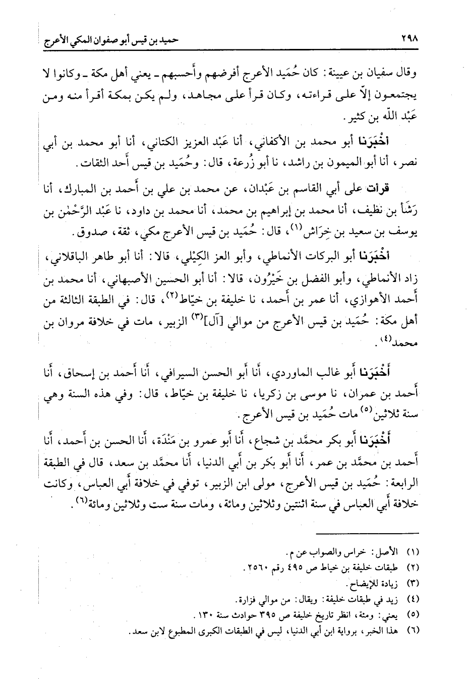 وقال سفيان بن عيينة كان حميد الأعرج أفرضهم وأحسبهم يعني أهل مكة وكانوا لا يجتمعون إلا على قراءته وكان قرأ على مجاهد ولم يكن بمكة أقرأ منه ومن عبد الله بن كثير أخبرنا أبو محمد بن الأكفاني أنا عبد العزيز الكتاني أنا أبو محمد بن أبي نصر أنا أيو الميمون بن راشد نا أبو زرعة قال وحميد بن قيس أحد الثقات قرأت على أبي القاسم بن عبدان عن محمد بن علي بن أحمد بن المبارك أنا رشأ بن نظيف أنا محمد بن إبراهيم بن محمد أنا محمد بن داود نا عبد الرحمن بن يوسف بن سعيد بن خراش (1) قال حميد بن قيس الأعرج مكي ثقة صدوق أخبرنا أبو البركات الأنماطي وأبو العز الكيلي قالا أنا أبو طاهر الباقلاني زاد الأنماطي وأبو الفضل بن خيرون قالا أنا أبو الحسين الأصبهاني أنا محمد بن أحمد الأهوازي أنا عمر بن أحمد نا خليفة بن خياط (2) قال في الطبقة الثالثة من أهل مكة حميد بن قيس الأعرج من موالي آل (3) الزبير مات في خلافة مروان بن محمد (4) أخبرنا أبو غالب الماوردي أنا أبو الحسن السيرافي أنا أحمد بن إسحاق أنا أحمد بن عمران نا موسى بن زكريا نا خليفة بن خياط قال وفي هذه السنة وهي سنة ثلاثين (5) مات حميد بن قيس الأعرج أخبرنا أبو بكر محمد بن شجاع أنا أبو عمرو بن مندة أنا الحسن بن أحمد أنا أحمد بن محمد بن عمر أنا أبو بكر بن أبي الدنيا أنا محمد بن سعد قال في الطبقة الرابعة حميد بن قيس الأعرج مولى ابن الزبير توفي في خلافة أبي العباس وكانت خلافة أبي العباس في سنة اثنتين وثلاثين ومائة ومات سنة ست وثلاثين ومائة