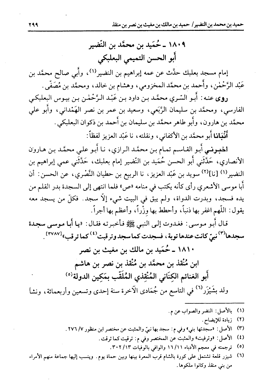 1809 - حميد بن محمد بن النضير أبو الحسن التميمي البعلبكي إمام مسجد بعلبك حدث عن عمه إبراهيم بن النضير (1) وأبي صالح محمد بن عبد الرحمن وأحمد بن محمد المخزومي وهشام بن خالد ومحمد بن مصفى روى عنه أبو السري محمد بن داود بن عبد الرحمن بن بيوس البعلبكي الفارسي ومحمد بن سليمان الربعي وسعيد بن عمر بن نصر الهمداني وأبو علي محمد بن هارون وأبو طاهر محمد بن سليمان بن أحمد بن ذكوان البعلبكي أنبأنا أبو محمد بن الأكفاني ونقلته نا عبد العزيز لفظا أخبرني أبو القاسم تمام بن محمد الرازي نا أبو علي محمد بن هارون الأنصاري حدثني أبو الحسن حميد بن النضير إمام بعلبك حدثني عمي إبراهيم بن النضير (1) نا (2) سويد بن عبد العزيز نا الربيع بن حطيان النصري عن الحسن أن أبا موسى الأشعري رأى كأنه يكتب في منامه ص فلما انتهى إلى السجدة بدر القلم من يده فسجد وبدرت الدواة ولم يبق في البيت شئ إلا سجد فكل من يسجد معه يقول اللهم اغفر بها ذنبا وأحطط بها وزرا وأعظم بها أجرا قال أبو موسى فغدوت إلى النبي (صلى الله عليه وسلم) فأخبرته فقال يا أبا موسى سجدة سجدها (3) نبي كانت عندها توبة فسجدت كما سجد وترقبت (4) كما ترقب (3787)