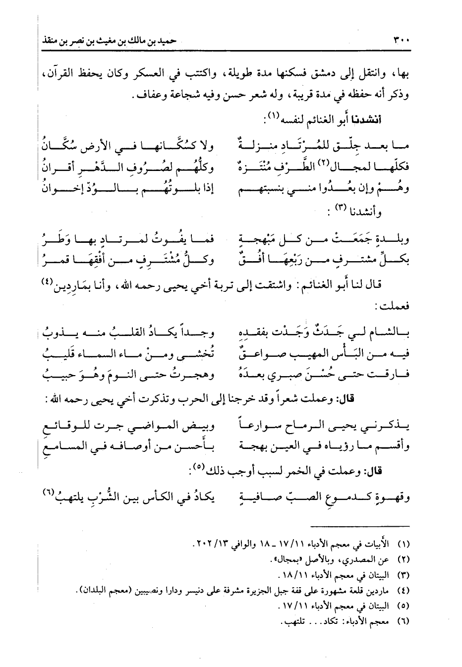بها وانتقل إلى دمشق فسكنها مدة طويلة واكتتب في العسكر وكان يحفظ القرآن وذكر أنه حفظه في مدة قريبة وله شعر حسن وفيه شجاعة وعفاف أنشدنا أبو الغنائم لنفسه (1) * ما بعد جلق للمرتاد منزلة * ولا كسكانها في الأرض سكان فكلها لمجال (2) الطرف منتزه * وكلهم لصروف الدهر أقران وهم وإن بعدوا مني بنسبتهم * إذا بلوتهم بالود إخوان * وأنشدنا (3) * وبلدة جمعت من كل مبهجة * فما يفوت لمرتاد بها وطر بكل مشترف من ربعها أفق * وكل مشترف من أفقها قمر * قال لنا أبو الغنائم واشتقت إلى تربة أخي يحيى رحمه الله وأنا بماردين (4) فعملت * بالشام لي جدث وجدت بفقده * وجدا يكاد القلب منه يذوب فيه من البأس المهيب صواعق * تخشى ومن ماء السماء قليب فارقت حتى حسن صبري بعده * وهجرت حتى النوم وهو حبيب * قال وعملت شعرا وقد خرجنا إلى الحرب وتذكرت أخي يحيى رحمه الله * يذكرني يحيى الرماح سوارعا * وبيض المواضي جرت للوقائع وأقسم ما رؤياه في العين بهجة * بأحسن من أوصافه في المسامع * قال وعملت في الخمر لسبب أوجب ذلك (5) وقهوة كدموع الصب صافية * يكاد في الكأس بين الشرب يلتهب (6)