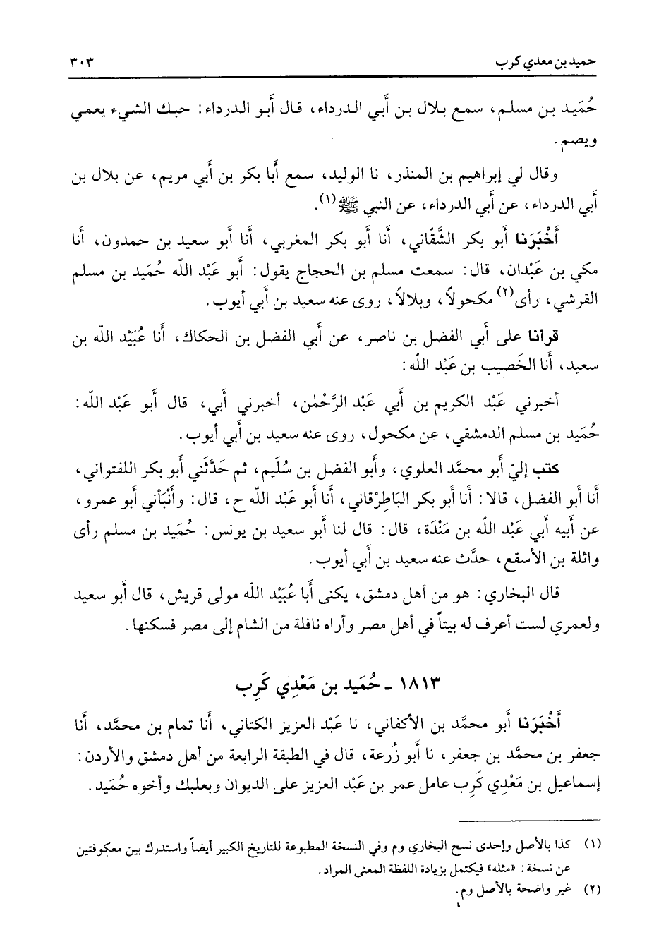1813 - حميد بن معدي كرب أخبرنا أبو محمد بن الأكفاني نا عبد العزيز الكتاني أنا تمام بن محمد أنا جعفر بن محمد بن جعفر نا أبو زرعة قال في الطبقة الرابعة من أهل دمشق والأردن إسماعيل بن معدي كرب عامل عمر بن عبد العزيز على الديوان وبعلبك وأخوه حميد