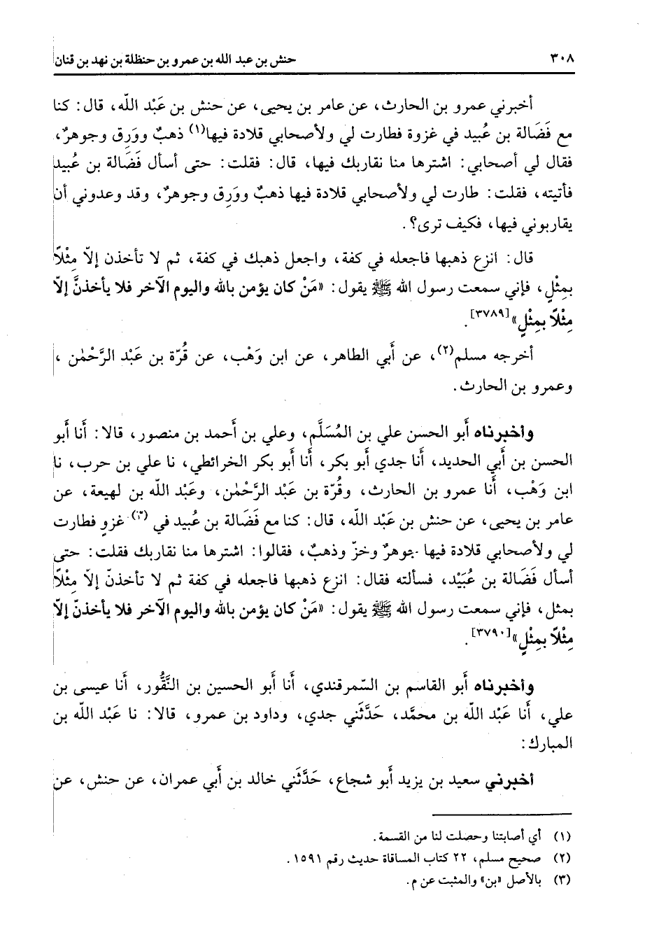 أخبرني عمرو بن الحارث عن عامر بن يحيى عن حنش بن عبد الله قال كنا مع فضالة بن عبيد في غزوة فطارت لي ولأصحابي قلادة فيها (1) ذهب وورق وجوهر فقال لي أصحابي اشترها منا نقاربك فيها قال فقلت حتى أسأل فضالة بن عبيد فأتيته فقلت طارت لي ولأصحابي قلادة فيها ذهب وورق وجوهر وقد وعدني أن يقاربوني فيها فكيف ترى قال انزع ذهبها فاجعله في كفة واجعل ذهبك في كفة ثم لا تأخذن إلا مثلا بمثل فإني سمعت رسول الله (صلى الله عليه وسلم) يقول من كان يؤمن بالله واليوم الآخر فلا يأخذن إلا مثل بمثل (3789) أخرجه مسلم (2) عن أبي الطاهر عن ابن وهب عن قرة إبن عبد الرحمن وعمرو بن الحارث وأخبرناه أبو الحسن علي بن المسلم وعلي بن أحمد بن منصور قالا أنا أبو الحسن بن أبي الحديد أنا جدي أبو بكر أنا أبو بكر الخرائطي نا علي بن حرب نا ابن وهب أنا عمرو بن الحارث وقرة بن عبد الرحمن وعبد الله بن لهيعة عن عامر بن يحيى عن حنش بن عبد الله قال كنا مع فضالة بن عبيد في (3) غزو فطارت لي ولأصحابي قلادة فيها جوهر وخز وذهب فقالوا اشترها منا نقاربك فقلت حتى أسأل فضالة بن عبيد فسألته فقال انزع ذهبها فاجعله في كفة ثم لا تأخذن إلا مثل بمثل فإني سمعت رسول الله (صلى الله عليه وسلم) يقول من كان يؤمن بالله واليوم الآخر فلا يأخذن إلا مثل بمثل (3790) وأخبرناه أبو القاسم بن السمرقندي أنا أبو الحسين بن النقور أنا عيسى بن علي أنا عبد الله بن محمد حدثني جدي وداود بن عمرو قالا نا عبد الله بن المبارك أخبرني سعيد بن يزيد أبو شجاع حدثني خالد بن أبي عمران عن حنش عن