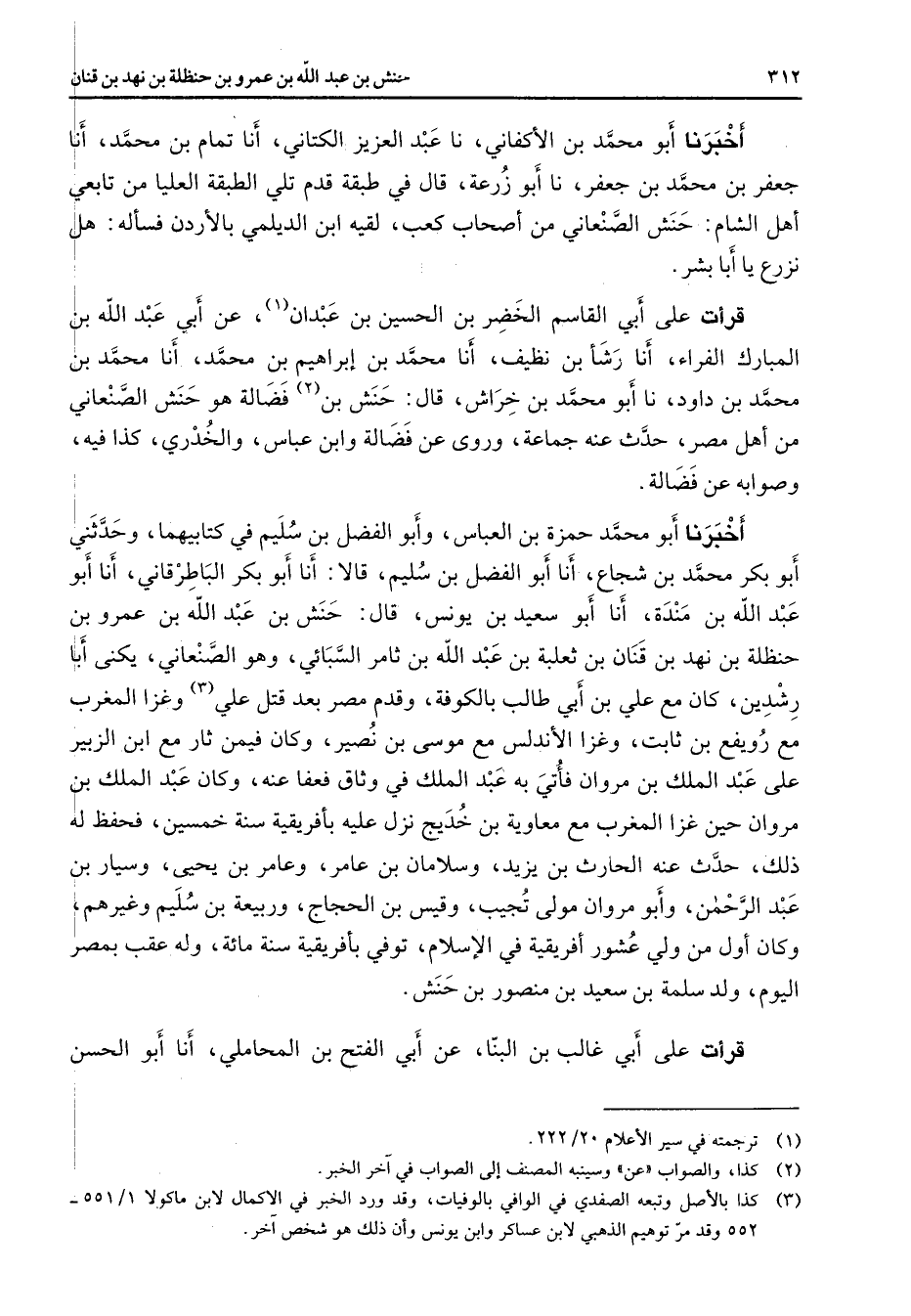 أخبرنا أبو محمد بن الأكفاني نا عبد العزيز الكتاني أنا تمام بن محمد نا جعفر بن محمد بن جعفر نا أبو زرعة قال في طبقة قدم تلي الطبقة العليا من تابعي أهل الشام حنش الصنعاني من أصحاب كعب لقيه ابن الديلمي بالأردن فسأله هل نزرع يا أبا بشر قرأت على أبي القاسم الخضر بن الحسين بن عبدان (1) عن أبي عبد الله بن المبارك الفراء أنا رشأ بن نظيف أنا محمد بن إبراهيم بن محمد أنا محمد بن محمد بن داود نا أبو محمد بن خراش قال حنش بن (2) فضالة هو حنش الصنعاني من أهل مصر حدث عنه جماعة وروى عن فضالة وابن عباس والخدري كذا فيه وصوابه عن فضالة أخبرنا أبو محمد حمزة بن العباس وأبو الفضل بن سليم في كتابيهما وحدثني أبو بكر محمد بن شجاع أنا أبو الفضل بن سليم قالا أنا أبو بكر الباطرقاني أنا أبو عبد الله بن مندة أنا أبو سعيد بن يونس قال حنش بن عبد الله بن عمرو بن حنظلة بن نهد بن قنان بن ثعلبة بن عبد الله بن ثامر السبائي وهو الصنعاني يكنى أبا رشدين كان مع علي بن أبي طالب بالكوفة وقدم مصر بعد قتل علي (3) وغزا المغرب مع رويفع بن ثابت وغزا الأندلس مع موسى بن نصير وكان فيمن ثار مع ابن الزبير على عبد الملك بن مروان فأتي به عبد الملك في وثاق فعفا عنه وكان عبد الملك بن مروان حين غزا المغرب مع معاوية بن خديج نزل عليه بأفريقية سنة خمسين فحفظ له ذلك حدث عنه الحارث بن يزيد وسلامان بن عامر وعامر بن يحيى وسيار بن عبد الرحمن وأبو مروان مولى تجيب وقيس بن الحجاج وربيعة بن سليم وغيرهم وكان أول من ولي عشور أفريقية في الإسلام توفي بأفريقية سنة مائة وله عقب بمصر اليوم ولد سلمة بن سعيد بن منصور بن حنش قرأت على أبي غالب بن البنا عن أبي الفتح بن المحاملي أنا أبو الحسن