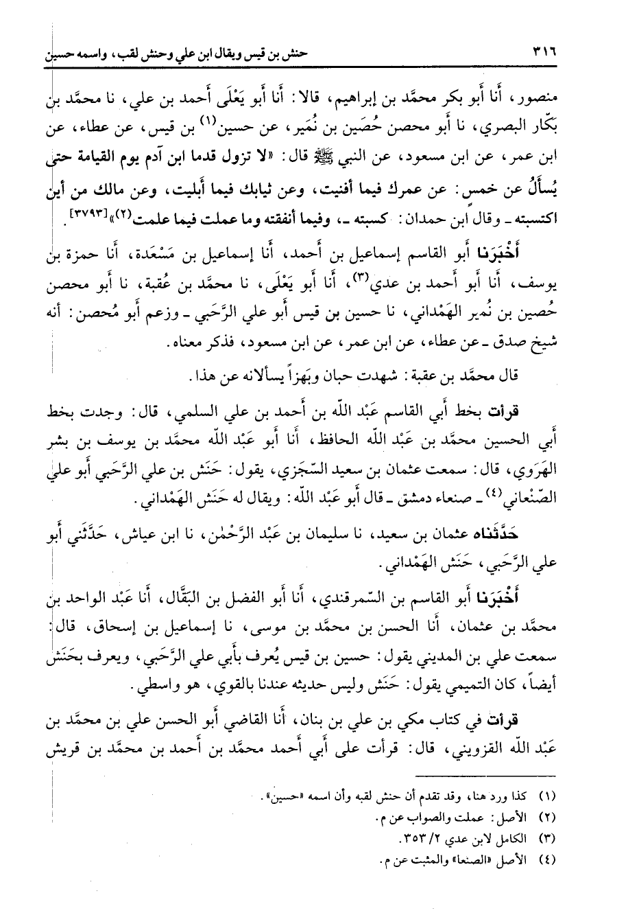 منصور أنا أبو بكر محمد بن إبراهيم قالا أنا أبو يعلى أحمد بن علي نا محمد بن بكار البصري نا أبو محصن حصين بن نمير عن حسين (1) بن قيس عن عطاء عن ابن عمر عن ابن مسعود عن النبي (صلى الله عليه وسلم) قال لا تزول قدما ابن آدم يوم القيامة حتى يسأل عن خمس عن عمرك فيما أفنيت وعن ثيابك فيما أبليت وعن مالك من أين اكتسبته وقال ابن حمدان كسبته وفيما أنفقته وما عملت فيما علمت (2) (3793) أخبرنا أبو القاسم إسماعيل بن أحمد أنا إسماعيل بن مسعدة أنا حمزة بن يوسف أنا أبو أحمد بن عدي (3) أنا أبو يعلى نا محمد بن عقبة نا أبو محصن حصين بن نمير الهمداني نا حسين بن قيس أبو علي الرحبي وزعم أبو محصن أنه شيخ صدق عن عطاء عن ابن عمر عن ابن مسعود فذكر معناه قال محمد بن عقبة شهدت حبان وبهزا يسألانه عن هذا قرأت بخط أبي القاسم عبد الله بن أحمد بن علي السلمي قال وجدت بخط أبي الحسين محمد بن عبد الله الحافظ أنا أبو عبد الله محمد بن يوسف بن بشر الهروي قال سمعت عثمان بن سعيد السجزي يقول حنش بن علي الرحبي أبو علي الصنعانى (4) صنعاء دمشق قال أبو عبد الله ويقال له حنش الهمداني حدثناه عثمان بن سعيد نا سليمان بن عبد الرحمن نا ابن عياش حدثني أبو علي الرحبي حنش الهمداني أخبرنا أبو القاسم بن السمرقندي أنا أبو الفضل بن البقال أنا عبد الواحد بن محمد بن عثمان أنا الحسن بن محمد بن موسى نا إسماعيل بن إسحاق قال سمعت علي بن المديني يقول حسين بن قيس يعرف بأبي علي الرحبي ويعرف بحنش أيضا كان التميمي يقول حنش وليس حديثه عندنا بالقوي هو واسطي قرأت في كتاب مكي بن علي بن بنان أنا القاضي أبو الحسن علي بن محمد بن عبد الله القزويني قال قرأت على أبي أحمد محمد بن أحمد بن محمد بن قريش