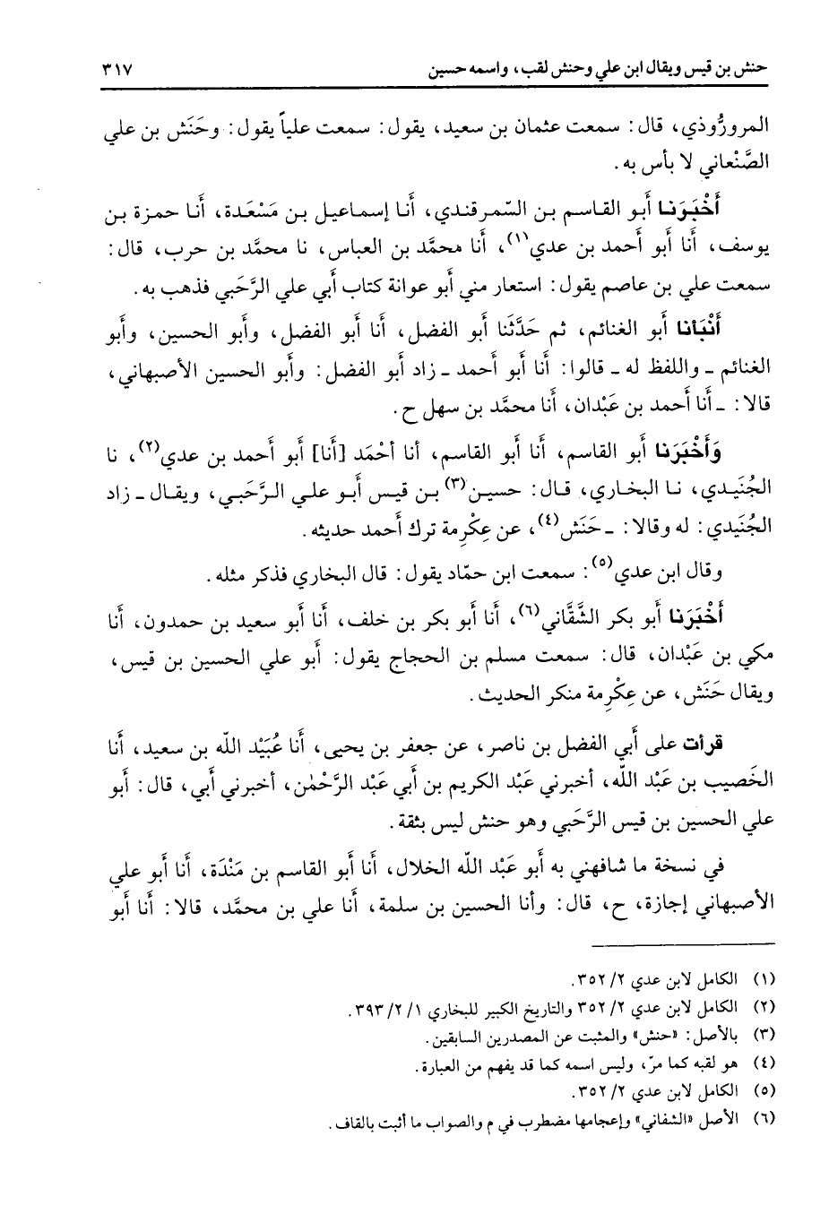 المروروذي قال سمعت عثمان بن سعيد يقول سمعت عليا يقول وحنش بن علي الصنعاني لا بأس به أخبرنا أبو القاسم بن السمرقندي أنا إسماعيل بن مسعدة أنا حمزة بن يوسف أنا أبو أحمد بن عدي (1) أنا محمد بن العباس نا محمد بن حرب قال سمعت علي بن عاصم يقول استعار مني أبو عوانة كتاب أبي علي الرحبي فذهب به أنبأنا أبو الغنائم ثم حدثنا أبو الفضل أنا أبو الفضل وأبو الحسين وأبو الغنائم واللفظ له قالوا أنا أبو أحمد زاد أبو الفضل وأبو الحسين الأصبهاني قالا أنا أحمد بن عبدان أنا محمد بن سهل ح وأخبرنا أبو القاسم أنا أبو القاسم أنا أحمد أنا أبو أحمد بن عدي (2) نا الجنيدي نا البخاري قال حسين (3) بن قيس أبو علي الرحبي ويقال زاد الجنيدي له وقالا حنش (4) عن عكرمة ترك أحمد حديثه وقال ابن عدي (5) سمعت ابن حماد يقول قال البخاري فذكر مثله أخبرنا أبو بكر الشقاني (6) أنا أبو بكر بن خلف أنا أبو سعيد بن حمدون أنا مكي بن عبدان قال سمعت مسلم بن الحجاج يقول أبو علي الحسين بن قيس ويقال حنش عن عكرمة منكر الحديث قرأت على أبي الفضل بن ناصر عن جعفر بن يحيى أنا عبيد الله بن سعيد أنا الخصيب بن عبد الله أخبرني عبد الكريم بن أبي عبد الرحمن أخبرني أبي قال أبو علي الحسين بن قيس الرحبي وهو حنش ليس بثقة في نسخة ما شافهني به أبو عبد الله الخلال أنا أبو القاسم بن مندة أنا أبو علي الأصبهاني إجازة ح قال وأنا الحسين بن سلمة أنا علي بن محمد قالا أنا أبو