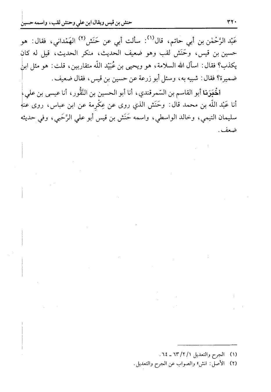عبد الرحمن بن أبي حاتم قال (1) سألت أبي عن حنش (2) الهمداني فقال هو حسين بن قيس وحنش لقب وهو ضعيف الحديث منكر الحديث قيل له كان يكذب فقال اسأل الله السلامة وهو ويحيى بن عبيد الله متقاربين قلت هو مثل ابن ضميرة فقال شبيه به وسئل أبو زرعة عن حسين بن قيس فقال ضعيف أخبرنا أبو القاسم بن السمرقندي أنا أبو الحسين بن النقور أنا عيسى بن علي أنا عبد الله بن محمد قال وحنش الذي روى عن عكرمة عن ابن عباس روى عنه سليمان التيمي وخالد الواسطي واسمه حنش بن قيس أبو علي الرحبي وفي حديثه ضعف