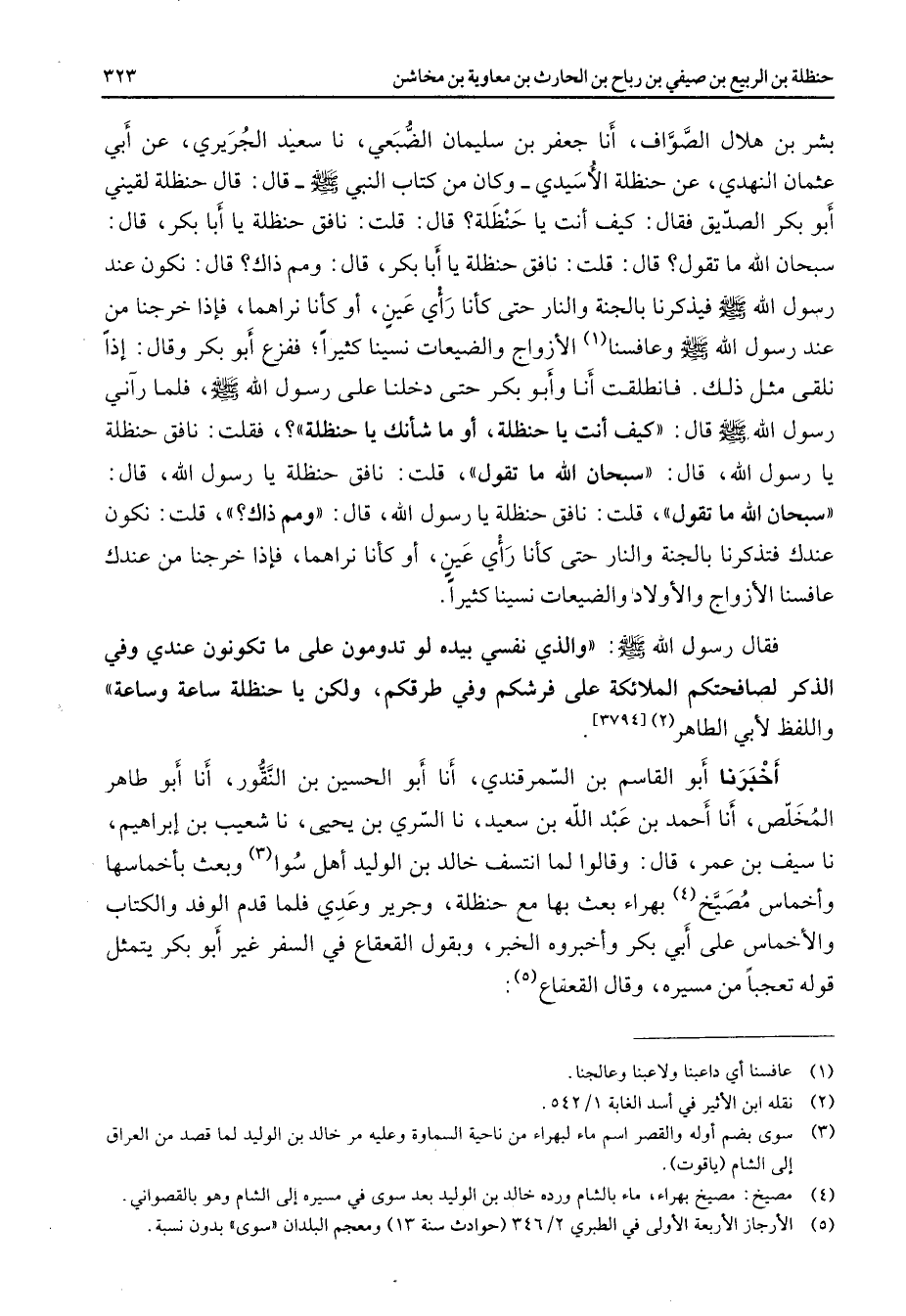 بشر بن هلال الصواف أنا جعفر بن سليمان الضبعي نا سعيد الجريري عن أبي عثمان النهدي عن حنظلة الأسيدي وكان من كتاب النبي (صلى الله عليه وسلم) قال قال حنظلة لقيني أبو بكر الصديق فقال كيف أنت يا حنظلة قال قلت نافق حنظلة يا أبا بكر قال سبحان الله ما تقول قال قلت نافق حنظلة يا أبا بكر قال ومم ذاك قال نكون عند رسول الله (صلى الله عليه وسلم) فيذكرنا بالجنة والنار حتى كأنا رأي عين أو كأنا نراهما فإذا خرجنا من عند رسول الله (صلى الله عليه وسلم) وعافسنا (1) الأزواج والضيعات نسينا كثيرا ففزع أبو بكر وقال إذا نلقى مثل ذلك فانطلقت أنا وأبو بكر حتى دخلنا على رسول الله (صلى الله عليه وسلم) فلما رآني رسول الله (صلى الله عليه وسلم) قال كيف أنت يا حنظلة أو ما شأنك يا حنظلة فقلت نافق حنظلة يا رسول الله قال سبحان الله ما تقول قلت نافق حنظلة يا رسول الله قال سبحان الله ما تقول قلت نافق حنظلة يا رسول الله قال ومم ذاك قلت نكون عندك فتذكرنا بالجنة والنار حتى كأنا رأى عين أو كأنا نراهما فإذا خرجنا من عندك عافسنا الأزواج والأولاد والضيعات نسينا كثيرا فقال رسول الله (صلى الله عليه وسلم) والذي نفسي بيده لو تدومون على ما تكونون عندي وفي الذكر لصافحتكم الملائكة على فرشكم وفي طرقكم ولكن يا حنظلة ساعة وساعة واللفظ لأبي الطاهر (2) (3794) أخبرنا أبو القاسم بن السمرقندي أنا أبو الحسين بن النقور أنا أبو طاهر المخلص أنا أحمد بن عبد الله بن سعيد نا السري بن يحيى نا شعيب بن إبراهيم نا سيف بن عمر قال وقالوا لما انتسف خالد بن الوليد أهل سوا (3) وبعث بأخماسها وأخماس مصيخ (4) بهراء بعث بها مع حنظلة وجرير وعدي فلما قدم الوفد والكتاب والأخماس على أبي بكر وأخبروه الخبر وبقول القعقاع في السفر غير أبو بكر يتمثل قوله تعجبا من مسيره وقال القعقاع (5)