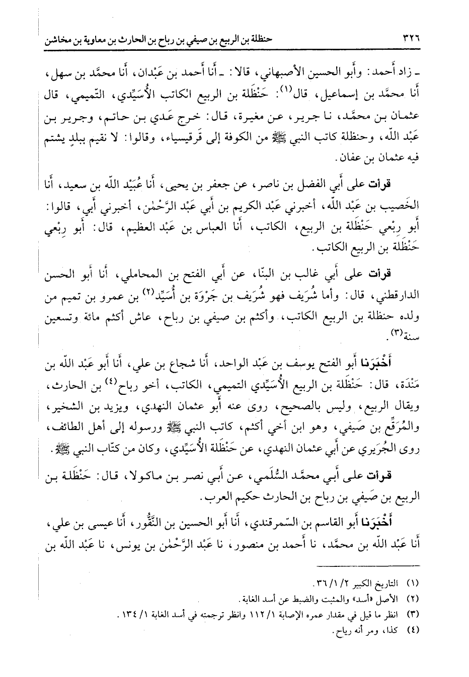 زاد أحمد وأبو الحسين الأصبهاني قالا أنا أحمد بن عبدان أنا محمد بن سهل أنا محمد بن إسماعيل قال (1) حنظلة بن الربيع الكاتب الأسيدي التميمي قال عثمان بن محمد نا جرير عن مغيرة قال خرج عدي بن حاتم وجرير بن عبد الله وحنظلة كاتب النبي (صلى الله عليه وسلم) من الكوفة إلى قرقيسياء وقالوا لا نقيم ببلد يشتم فيه عثمان بن عفان قرأت على أبي الفضل بن ناصر عن جعفر بن يحيى أنا عبيد الله بن سعيد أنا الخصيب بن عبد الله أخبرني عبد الكريم بن أبي عبد الرحمن أخبرني أبي قالوا أبو ربعي حنظلة بن الربيع الكاتب أنا العباس بن عبد العظيم قال أبو ربعي حنظلة بن الربيع الكاتب قرأت على أبي غالب بن البنا عن أبي الفتح بن المحاملي أنا أبو الحسن الدارقطني قال وأما شريف فهو شريف بن جروة بن أسيد (2) بن عمرو بن تميم من ولده حنظلة بن الربيع الكاتب وأكثم بن صيفي بن رباح عاش أكثم مائة وتسعين سنة (3) أخبرنا أبو الفتح يوسف بن عبد الواحد أنا شجاع بن علي أنا أبو عبد الله بن مندة قال حنظلة بن الربيع الأسيدي التميمي الكاتب أخو رباح (4) بن الحارث ويقال الربيع وليس بالصحيح روى عنه أبو عثمان النهدي ويزيد بن الشخير والمرقع بن صيفي وهو ابن أخي أكثم كاتب النبي (صلى الله عليه وسلم) ورسوله إلى أهل الطائف روى الجريري عن أبي عثمان النهدي عن حنظلة الأسيدي وكان من كتاب النبي (صلى الله عليه وسلم) قرأت على أبي محمد السلمي عن أبي نصر بن ماكولا قال حنظلة بن الربيع بن صيفي بن رباح بن الحارث حكيم العرب أخبرنا أبو القاسم بن السمرقندي أنا أبو الحسين بن النقور أنا عيسى بن علي أنا عبد الله بن محمد نا أحمد بن منصور نا عبد الرحمن بن يونس نا عبد الله بن