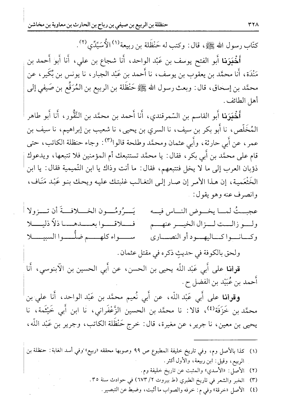 كتاب رسول الله (صلى الله عليه وسلم) قال وكتب له حنظلة بن ربيعة (1) الأسيدي (2) أخبرنا أبو الفتح يوسف بن عبد الواحد أنا شجاع بن علي أنا أبو أحمد بن مندة أنا محمد بن يعقوب بن يوسف نا أحمد بن عبد الجبار نا يونس بن بكير عن محمد بن إسحاق قال وبعث رسول الله (صلى الله عليه وسلم) حنظلة بن الربيع بن المرقع بن صيفي إلى أهل الطائف أخبرنا أبو القاسم بن السمرقندي أنا أحمد بن محمد بن النقور أنا أبو طاهر المخلص نا أبو بكر بن سيف نا السري بن يحيى نا شعيب بن إبراهيم نا سيف بن عمر عن أبي حارثة وأبي عثمان ومحمد وطلحة قالوا (3) وجاء حنظلة الكاتب حتى قام على محمد بن أبي بكر فقال يا محمد تستتبعك أم المؤمنين فلا تتبعها ويدعوك ذؤبان العرب إلى ما لا يخل فتتبعهم فقال ما أنت وذاك يا ابن التميمية فقال يا ابن الخثعمية إن هذا الأمر إن صار إلى التغالب غلبتك عليه ويحك بنو عبد مناف وانصرف عنه وهو يقول * عجبت لما يخوض الناس فيه * يرومون الخلافة أن تزولا ولو زالت لزال الخير عنهم * فلاقوا بعدها ذلا ذليلا وكانوا كاليهود أو النصارى * سواء كلهم ضلوا السبيلا * ولحق بالكوفة في حديث ذكره في مقتل عثمان قرأنا على أبي عبد الله يحيى بن الحسن عن أبي الحسين بن الآبنوسي أنا أحمد بن عبيد بن الفضل ح وقرأنا على أبي عبد الله عن أبي نعيم محمد بن عبد الواحد أنا علي بن محمد بن خزفة (4) قالا نا محمد بن الحسين الزعفراني نا ابن أبي خيثمة نا يحيى بن معين نا جرير عن مغيرة قال خرج حنظلة الكاتب وجرير بن عبد الله