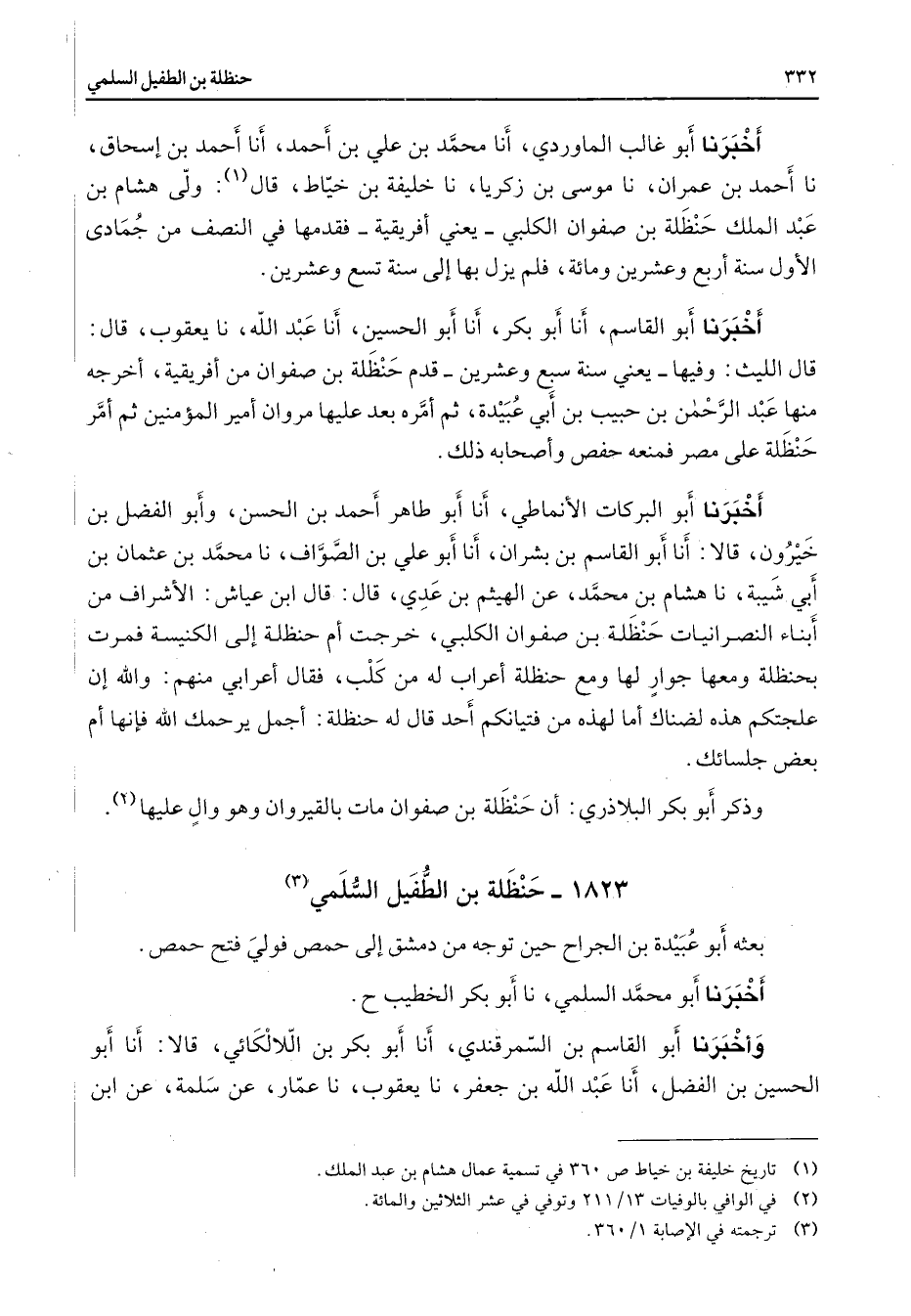 1823 - حنظلة بن الطفيل السلمي (3) بعثه أبو عبيدة بن الجراح حين توجه من دمشق إلى حمص فولي فتح حمص أخبرنا أبو محمد السلمي نا أبو بكر الخطيب ح وأخبرنا أبو القاسم بن السمرقندي أنا أبو بكر بن اللالكائي قالا أنا أبو الحسين بن الفضل أنا عبد الله بن جعفر نا يعقوب نا عمار عن سلمة عن ابن