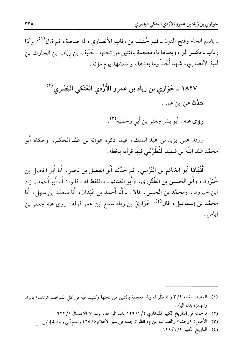 1827 - حواري بن زياد بن عمرو الأزدي العتكي البصري (2) حدث عن ابن عمر روى عنه أبو بشر جعفر بن أبي وحشية (3) ووفد على يزيد بن عبد الملك فيما ذكره عوانة بن عبد الحكم وحكاه أبو محمد عبد الله بن شهيد القطربلي فيها قرأته بخطه أنبأنا أبو الغنائم بن النرسي ثم حدثنا أبو الفضل بن ناصر أنا أبو الفضل بن خيرون وأبو الحسين بن الطيوري وأبو الغنائم واللفظ له قالوا أنا أبو أحمد زاد ابن خيرون ومحمد بن الحسن قالا أنا أحمد بن عبدان أنا محمد بن سهل أنا محمد بن إسماعيل قال (4) حواري بن زياد سمع ابن عمر قوله روى عنه جعفر بن إياس