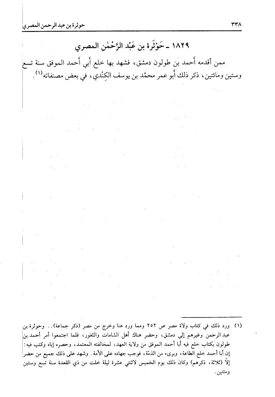 1829 - حوثرة بن عبد الرحمن المصري ممن أقدمه أحمد بن طولون دمشق فشهد بها خلع أبي أحمد الموفق سنة تسع وستين ومائتين ذكر ذلك أبو عمر محمد بن يوسف الكندي في بعض مصنفاته (1)