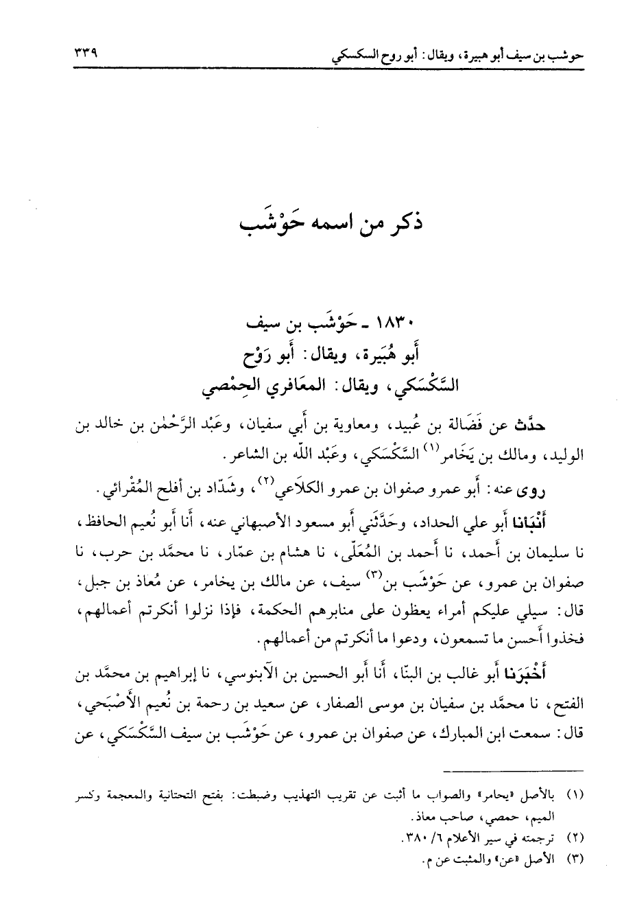 1830 - حوشب بن يوسف أبو هبيرة ويقال أبو روح السكسكي ويقال المعافري الحمصي حدث عن فضالة بن عبيد ومعاوية بن أبي سفيان وعبد الرحمن بن خالد بن الوليد ومالك بن يخامر السكسكي وعبد الله بن الشاعر روى عنه أو عمرو صفوان بن عمرو الكلاعي (2) وشداد بن أفلح لح المقرائي أنبأنا أبو علي الحداد وحدثني أبو مسعود الأصبهاني عنه أنا أبو نعيم الحافظ نا سليمان بن أحمد نا أحمد بن المعلى نا هشام بن عمار نا محمد بن حرب نا صفوان بن عمرو عن حوشب بن (3) سيف عن مالك بن يخامر عن معاذ بن جبل قال سيلي عليكم أمراء يعظون على منابرهم الحكمة فإذا نزلوا أنكرتم أعمالهم فخذوا أحسن ما تسمعون ودعوا ما أنكرتم من أعمالهم أخبرنا أبو غالب بن البنا أنا أبو الحسين بن الآبنوسي نا إبراهيم بن محمد بن الفتح نا محمد بن سفيان بن موسى الصفار عن سعيد بن رحمة بن نعيم الأصبحي قال سمعت ابن المبارك عن صفوان بن عمرو عن حوشب بن سيف السكسكي عن