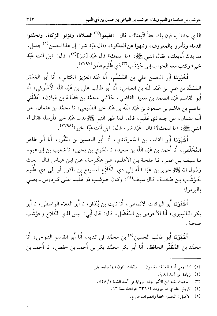 الذي جئتنا به فإن يك حقا اتبعناك قال تقيموا الصلاة وتؤتوا الزكاة وتحقنوا الدماء وتأمروا بالمعروف وتنهوا عن المنكر فقال عبد شر إن هذا لحسن (1) جميل مد يدك أبايعك فقال النبي (صلى الله عليه وسلم) ما اسمك قال عبد شر (2) قال بل أنت عبد خيرا ح وكتب معه الجواب إلى حوشب (3) ذي ظليم فآمن (3797) أخبرنا أبو الحسن علي بن المسلم أنا عبد العزيز الكتاني أنا أبو المعمر المسدد بن علي بن عبد الله بن العباس أنا أبو طالب علي بن عبد الله الأملوكي أنا أبو القاسم عبد الصمد بن سعيد القاضي حدثني محمد بن فضالة بن غيلان حدثني عاصم بن هاشم بن مسعود بن عبد الله بن عبد خير الطليمي نا محمد بن عثمان عن أبيه عثمان عن جده ذي ظليم قال لما ظهر النبي (صلى الله عليه وسلم) ندب عبد خير فأرسله فقال له النبي (صلى الله عليه وسلم) ما اسمك قال عبد شر قال بل أنت عبد خير (3798) أخبرنا أبو القاسم بن السمرقندي أنا أبو الحسين بن النقور أنا أبو طاهر المخلص أنا أحمد بن عبد الله بن سعيد نا السري بن يحيى نا شعيب بن إبراهيم نا سيف بن عمر نا طلحة بن الأعلم عن عكرمة عن ابن عباس قال بعث رسول الله (صلى الله عليه وسلم) جرير بن عبد الله إلى ذي الكلاع أسميفع بن ناكور أو إلى ذي ظليم حوشب بن طخمة قال سيف (4) وكان حوشب ذو ظليم على كردوس يعني باليرموك أخبرنا أبو البركات الأنماطي أنا ثابت بن بندار نا أبو العلاء الواسطي نا أبو بكر البابسيري أنا الأحوص بن المفضل قال قال أبي ليس لذي الكلاع وحوشب صحبة أخبرنا أبو طالب الحسين (5) بن محمد في كتابه أنا أبو القاسم التنوخي أنا محمد بن المظفر الحافظ أنا أبو بكر محمد بكر بن أحمد بن حفص نا أحمد بن