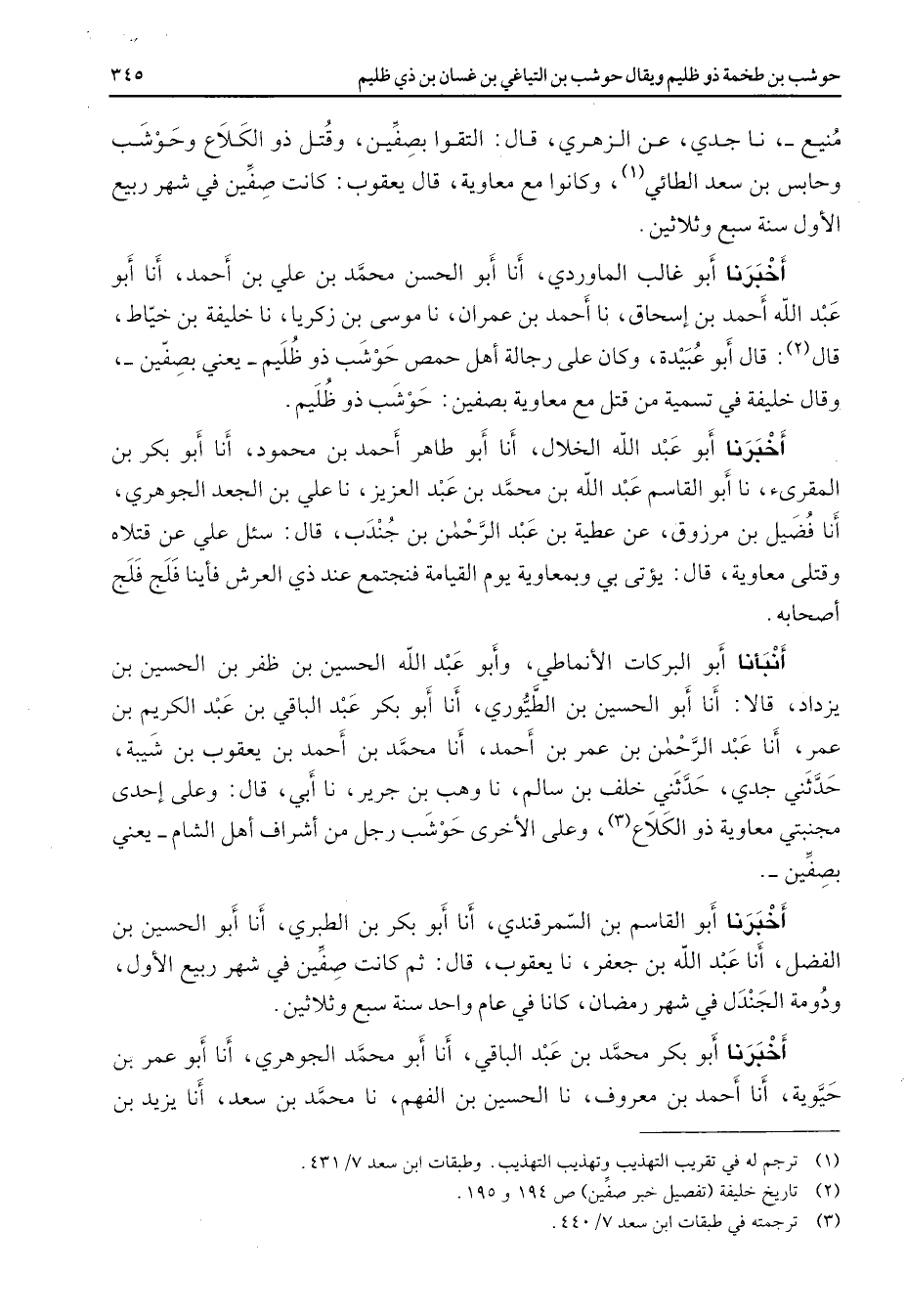 منيع نا جدي عن الزهري قال التقوا بصفين وقتل ذو الكلاع وحوشب وحابس بن سعد الطائي (1) وكانوا مع معاوية قال يعقوب كانت صفين في شهر ربيع الأول سنة سبع وثلاثين أخبرنا أبو غالب الماوردي أنا أبو الحسن محمد بن علي بن أحمد أنا أبو عبد الله أحمد بن إسحاق نا أحمد بن عمران نا موسى بن زكريا نا خليفة بن خياط قال (2) قال أبو عبيدة وكان على رجالة أهل حمص حوشب ذو ظليم يعني بصفين وقال خليفة في تسمية من قتل مع معاوية بصفين حوشب ذو ظليم أخبرنا أبو عبد الله الخلال أنا أبو طاهر أحمد بن محمود أنا أبو بكر بن المقرئ نا أبو القاسم عبد الله بن محمد بن عبد العزيز نا علي بن الجعد الجوهري أنا فضيل بن مرزوق عن عطية بن عبد الرحمن بن جندب قال سئل علي عن قتلاه وقتلى معاوية قال يؤتى بي وبمعاوية يوم القيامة فنجتمع عند ذي العرش فأينا فلج فلج أصحابه أنبأنا أبو البركات الأنماطي وأبو عبد الله الحسين بن ظفر بن الحسين بن يزداد قالا أنا أبو الحسين بن الطيوري أنا أبو بكر عبد الباقي بن عبد الكريم بن عمر أنا عبد الرحمن بن عمر بن أحمد أنا محمد بن أحمد بن يعقوب بن شيبة حدثني جدي حدثني خلف بن سالم نا وهب بن جرير نا أبي قال وعلى إحدى مجنبتي معاوية ذو الكلاع (3) وعلى الأخرى حوشب رجل من أشراف أهل الشام يعني بصفين أخبرنا أبو القاسم بن السمرقندي أنا أبو بكر بن الطبري أنا أبو الحسين بن الفضل أنا عبد الله بن جعفر نا يعقوب قال ثم كانت صفين في شهر ربيع الأول ودومة الجندل في شهر رمضان كانا في عام واحد سنة سبع وثلاثين أخبرنا أبو بكر محمد بن عبد الباقي أنا أبو محمد الجوهري أنا أبو عمر بن حيوية أنا أحمد بن معروف نا الحسين بن الفهم نا محمد بن سعد أنا يزيد بن