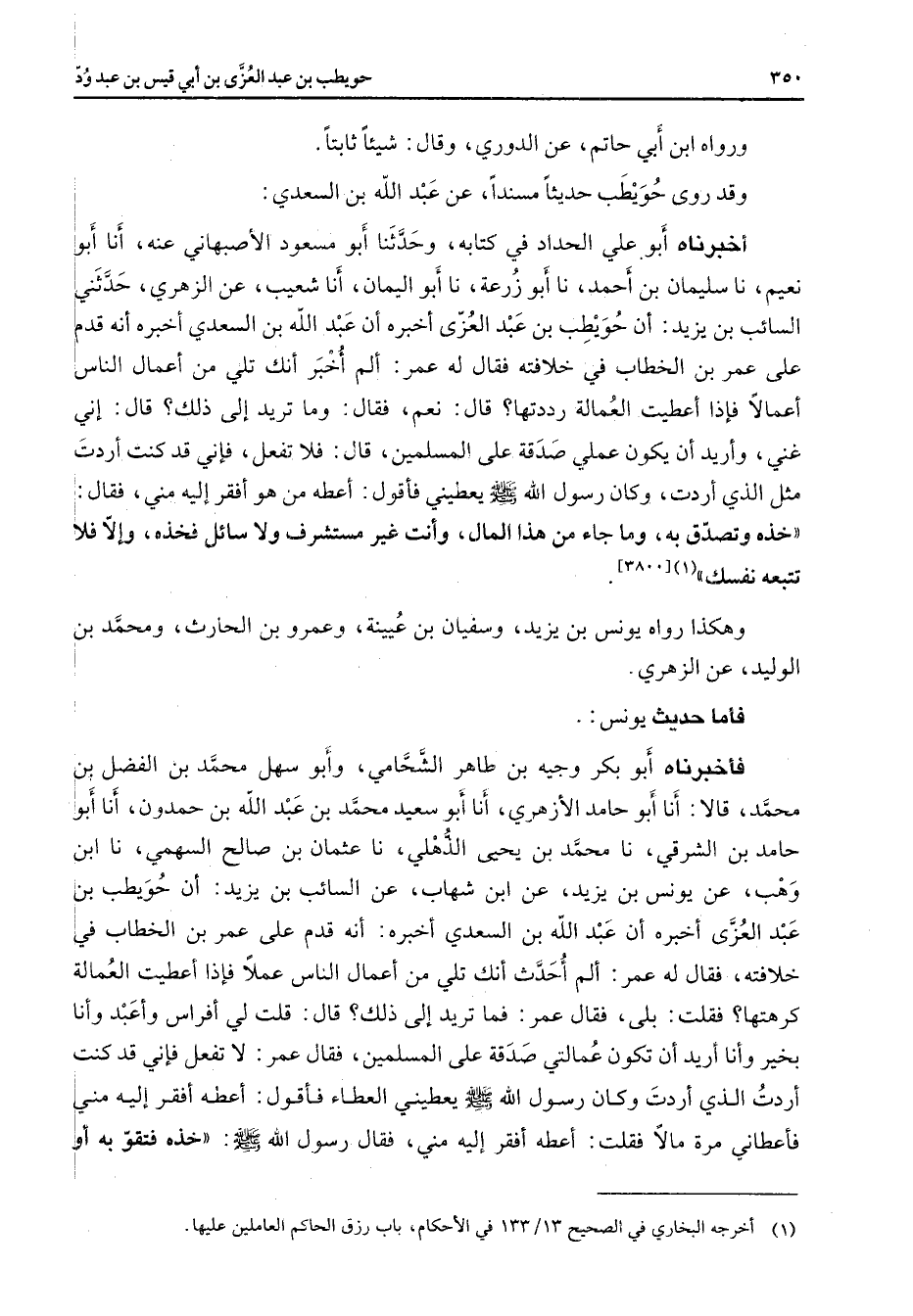 ورواه ابن أبي حاتم عن الدوري وقال شيئا ثابتا وقد روى حويطب حديثا مسندا عن عبد الله بن السعدي أخبرناه أبو علي الحداد في كتابه وحدثنا أبو مسعود الأصبهاني عنه أنا أبو نعيم نا سليمان بن أحمد نا أبو زرعة نا أبو اليمان أنا شعيب عن الزهري حدثني السائب بن يزيد أن حويطب بن عبد العزى أخبره أن عبد الله بن السعدي أخبره أنه قدم على عمر بن الخطاب في خلافته فقال له عمر ألم أخبر أنك تلي من أعمال الناس أعمالا فإذا أعطيت العمالة رددتها قال نعم فقال وما تريد إلى ذلك قال إني غني وأريد أن يكون عملي صدقة على المسلمين قال فلا تفعل فإني قد كنت أردت مثل الذي أردت وكان رسول الله (صلى الله عليه وسلم) يعطيني فأقول أعطه من هو أفقر إليه مني فقال خذه وتصدق به وما جاء من هذا المال وأنت غير مستشرف ولا سائل فخذه وإلا فلا تتبعه نفسك (1) (3800) وهكذا رواه يونس بن يزيد وسفيان بن عيينة وعمرو بن الحارث ومحمد بن الوليد عن الزهري فأما حديث يونس فأخبرناه أبو بكر وجيه بن طاهر الشحامي وأبو سهل محمد بن الفضل بن محمد قالا أنا أبو حامد الأزهري أنا أبو سعيد محمد بن عبد الله بن حمدون أنا أبو حامد بن الشرقي نا محمد بن يحيى الذهلي نا عثمان بن صالح السهمي نا ابن وهب عن يونس بن يزيد عن ابن شهاب عن السائب بن يزيد أن حويطب بن عبد العزى أخبره أن عبد الله بن السعدي أخبره أنه قدم على عمربن الخطاب في خلافته فقال له عمر ألم أحدث أنك تلي من أعمال الناس عملا فإذا أعطيت العمالة كرهتها فقلت بلى فقال عمر فما تريد إلى ذلك قال قلت لي أفراس وأعبد وأنا بخير وأنا أريد أن تكون عمالتي صدقة على المسلمين فقال عمر لا تفعل فإني قد كنت أردت الذي أردت وكان رسول الله (صلى الله عليه وسلم) يعطيني العطاء فأقول أعطه أفقر إليه مني فأعطاني مرة مالا فقلت أعطه أفقر إليه مني فقال رسول الله (صلى الله عليه وسلم) خذه فتقو به أو
