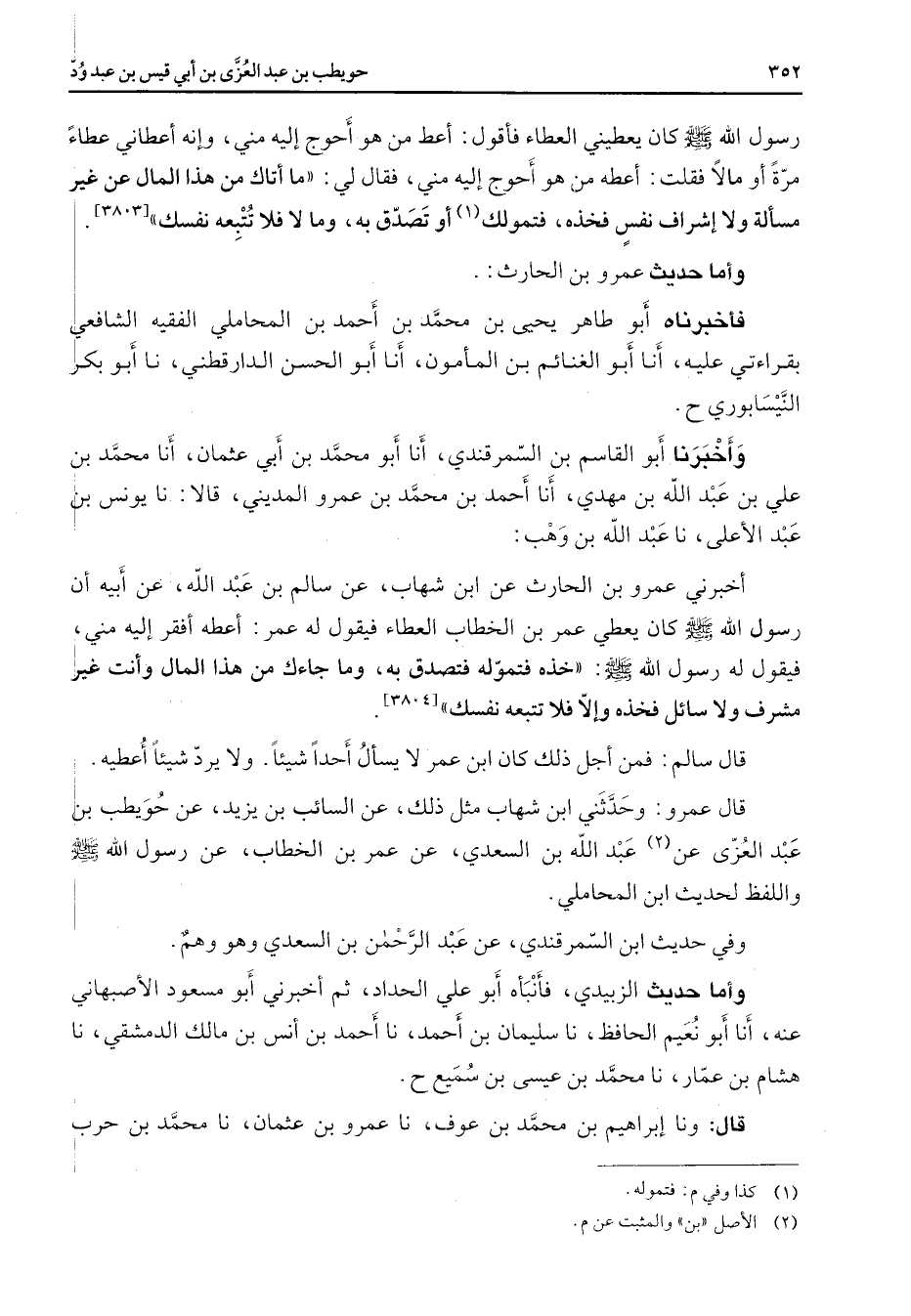 رسول الله (صلى الله عليه وسلم) كان يعطيني العطاء فأقول أعط من هو أحوج إليه مني وإنه أعطاني عطاء مرة أو مالا فقلت أعطه من هو أحوج إليه مني فقال لي ما أتاك من هذا المال عن غير مسألة ولا إشراف نفس فخذه فتمولك أو تصدق به وما لا فلا تتبعه نفسك (3803) وأما حديث عمرو بن الحارث فأخبرناه أبو طاهر يحيى بن محمد بن أحمد بن المحاملي الفقيه الشافعي بقراءتي عليه أنا أبو الغنائم بن المأمون أنا أبو الحسن الدارقطني نا أبو بكر النيسابوري ح وأخبرنا أبو القاسم بن السمرقندي أنا أبو محمد بن أبي عثمان أنا محمد بن علي بن عبد الله بن مهدي أنا أحمد بن محمد بن عمرو المديني قالا نا يونس بن عبد الأعلى نا عبد الله بن وهب أخبرني عمرو بن الحارث عن ابن شهاب عن سالم بن عبد الله عن أبيه أن رسول الله (صلى الله عليه وسلم) كان يعطي عمر بن الخطاب العطاء فيقول له عمر أعطه أفقر إليه مني فيقول له رسول الله (صلى الله عليه وسلم) خذه فتموله فتصدق به وما جاءك من هذا المال وأنت غير مشرف ولا سائل فخذه وإلا فلا تتبعه نفسك (3804) قال سالم فمن أجل ذلك كان ابن عمر لا يسال أحدا شيئا ولا يرد شيئا أعطيه قال عمرو وحدثني ابن شهاب مثل ذلك عن السائب بن يزيد عن حويطب بن عبد العزى عن عبد الله بن السعدي عن عمر بن الخطاب عن رسول الله (صلى الله عليه وسلم) واللفظ لحديث ابن المحاملي وفي حديث ابن السمرقندي عن عبد الرحمن بن السعدي وهو وهم وأما حديث الزبيدي فأنبأه أبو علي الحداد ثم أخبرني أبو مسعود الأصبهاني عنه أنا أبو نعيم الحافظ نا سليمان بن أحمد نا أحمد بن أنس بن مالك الدمشقي نا هشام بنعمار نا محمد بن عيسى بن سميع ح قال ونا إبراهيم بن محمد بن عوف نا عمرو بن عثمان نا محمد بن حرب
