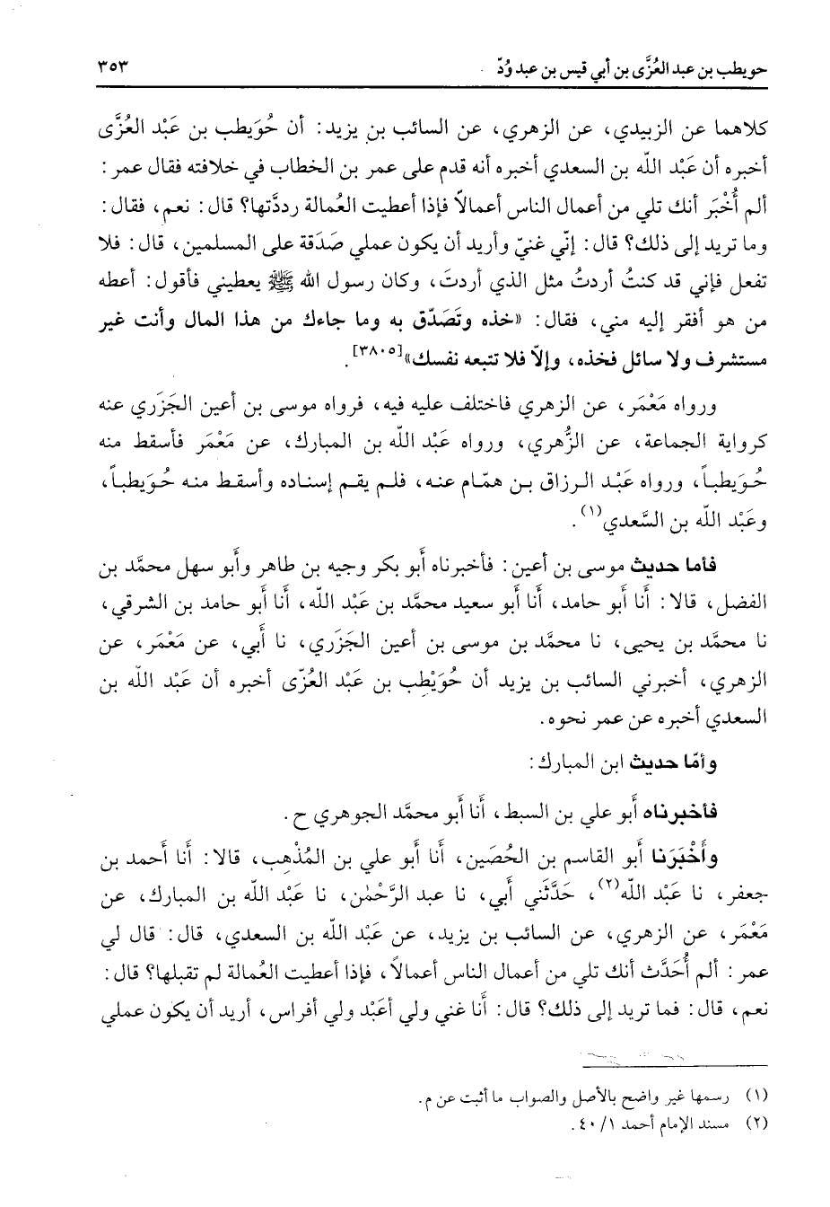 كلاهما عن الزبيدي عن الزهري عن السائب بن يزيد أن حويطب بن عبد العزى أخبره أن عبد الله بن السعدي أخبره أنه قدم على عمر بن الخطاب في خلافته فقال عمر ألم أخبر أنك تلي من أعمال الناس أعمالا فإذا أعطيت العمالة رددتها قال نعم فقال وما تريد إلى ذلك قال إني غني وأريد أن يكون عملي صدقة على المسلمين قال فلا تفعل فإني قد كنت أردت مثل الذي أردت وكان رسول الله (صلى الله عليه وسلم) يعطيني فأقول أعطه من هو أفقر إليه مني فقال خذه وتصدق به وما جاءك من هذا المال وأنت غير مستشرف ولا سائل فخذه وإلا فلا تتبعه نفسك (3805) ورواه معمر عن الزهري فاختلف عليه فيه فرواه موسى بن أعين الجزري عنه كرواية الجماعة عن الزهري ورواه عبد الله بن المبارك عن معمر فاسقط منه حويطبا ورواه عبد الرزاق بن همام عنه فلم يقم إسناده وأسقط منه حويطبا وعبد الله بن السعدي (1) فأما حديث موسى بن أعين فأخبرناه أبو بكر وجيه بن طاهر وأبو سهل محمد بن الفضل قالا أنا أبو حامد أنا أبو سعيد محمد بن عبد الله أنا أبو حامد بن الشرقي نا محمد بن يحيى نا محمد بن موسى بن أعين الجزري نا أبي عن معمر عن الزهري أخبرني السائب بن يزيد أن حويطب بن عبد العزى أخبره أن عبد الله بن السعدي أخبره عن عمر نحوه وأما حديث ابن المبارك فأخبرناه أبو علي بن السبط أنا أبو محمد الجوهري ح وأخبرنا أبو القاسم بن الحصين أنا أبو علي بن المذهب قالا أنا أحمد بن جعفر نا عبد الله (2) حدثني أبي نا عبد الرحمن نا عبد الله بن المبارك عن معمر عن الزهري عن السائب بن يزيد عن عبد الله بن السعدي قال قال لي عمر ألم أحدث أنك تلي من أعمال الناس أعمالا فإذا أعطيت العمالة لم تقبلها قال نعم قال فما تريد إلى ذلك قال أنا غني ولي أعبد ولي أفراس أريد أن يكون عملي