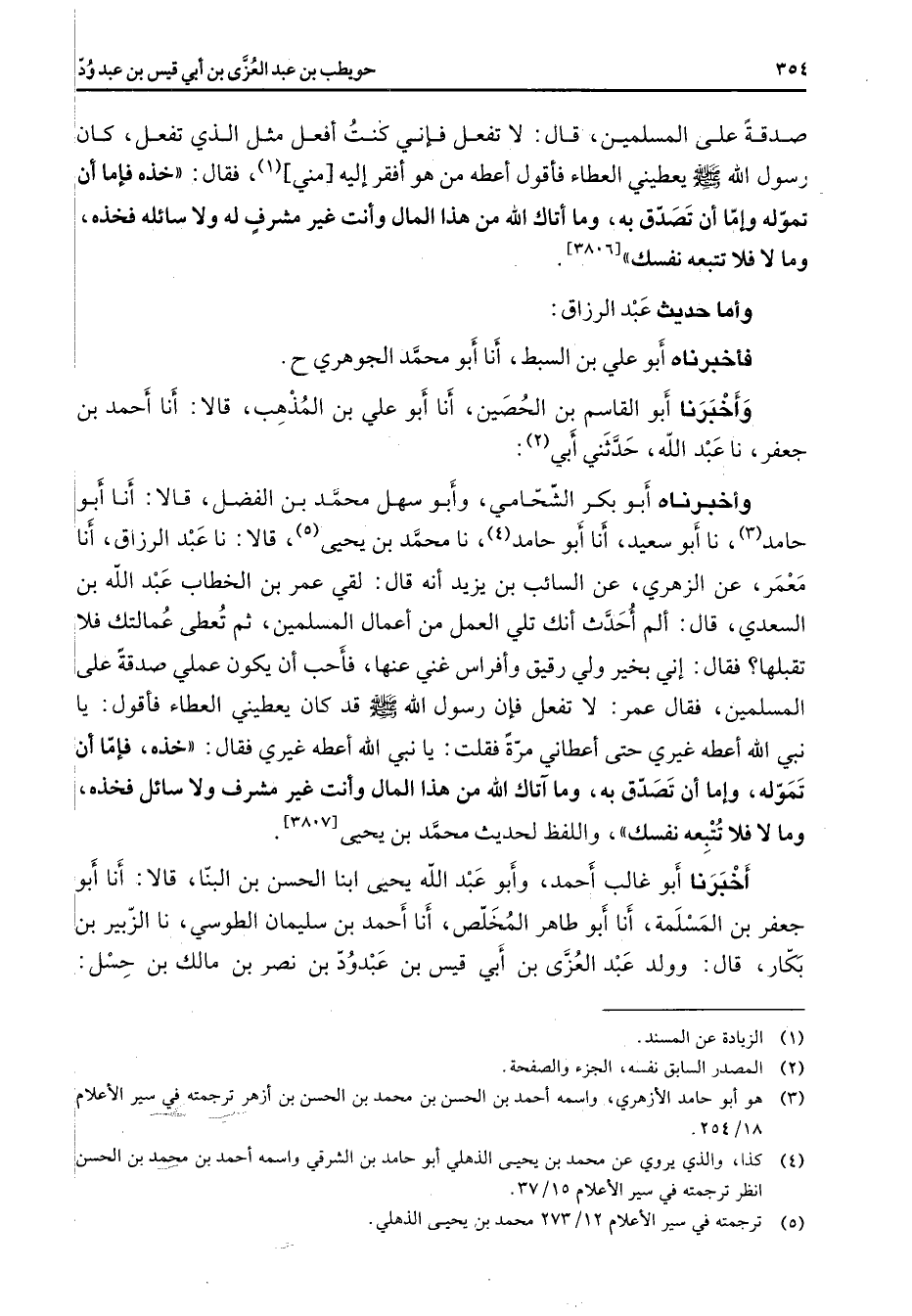 صدقة على المسلمين قال لا تفعل فإني كنت أفعل مثل الذي تفعل كان رسول الله (صلى الله عليه وسلم) يعطيني العطاء فاقول أعطه من هو أفقر إليه مني فقال خذه فإما أن تموله وإما أن تصدق به وما أتاك الله من هذا المال وأنت غير مشرف له ولا سائله فخذه وما لا فلا تتبعه نفسك (3806) وأما حديث عبد الرزاق فأخبرناه أبو علي بن السبط أنا أبو محمد الجوهري ح وأخبرنا أبو القاسم بن الحصين أنا أبو علي بن المذهب قالا أنا أحمد بن جعفر نا عبد الله حدثني أبي (2) وأخبرناه أبو بكر الشحامي وأبو سهل محمد بن الفضل قالا أنا أبو حامد (3) نا أبو سعيد أنا أبو حامد (4) نا محمد بن يحيى (5) قالا نا عبد الرزاق أنا معمر عن الزهري عن السائب بن يزيد أنه قال لقي عمر بن الخطاب عبد الله بن السعدي قال ألم أحدث أنك تلي العمل من أعمال المسلمين ثم تعطى عمالتك فلا تقبلها فقال إني بخير ولي رقيق وأفراس غني عنها فأحب أن يكون عملي صدقة على المسلمين فقال عمر لا تفعل فإن رسول الله (صلى الله عليه وسلم) كان يعطيني العطاء فأقول يا نبي الله أعطه غيري حتى أعطاني مرة فقلت يا نبي الله أعطه غيري فقال خذه فإما أن تموله وإما أن تصدق به وما آتاك الله من هذا المال وأنت غير مشرف ولا سائل فخذه وما لا فلا تتبعه نفسك ح واللفظ لحديث محمد بن يحيى (3807) أخبرنا أبو غالب أحمد وأبو عبد الله يحيى ابنا الحسن بن البنا قالا أنا أبو جعفر بن المسلمة أنا أبو طاهر المخلص أنا أحمد بن سليمان الطوسي نا الزبير بن بكار قال وولد عبد العزى بن أبي قيس بن عبدود بن نصر بن مالك بن حسل